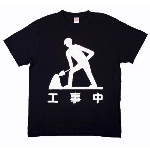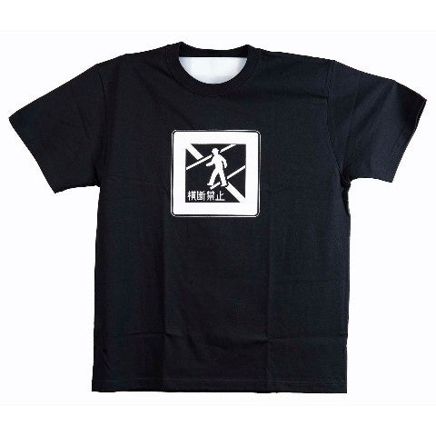 全国の都市部で見かける歩行者横断禁止標識の図柄を、白単色の絵柄とし、黒Tシャツの胸に配置した、シンプルでスタイリッシュなデザイン。