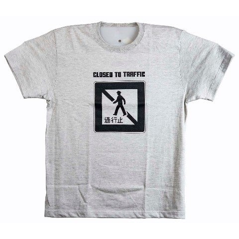 歩行者通行禁止標識の図柄を、Closed to traffic の文字と共にTシャツの胸に配置。