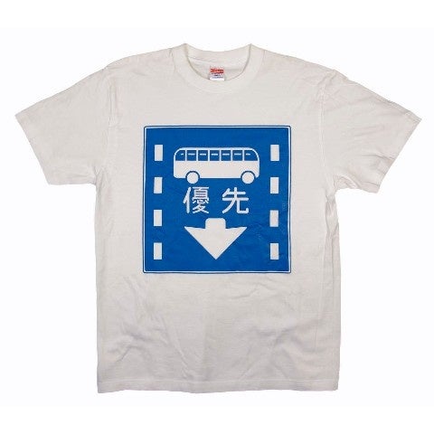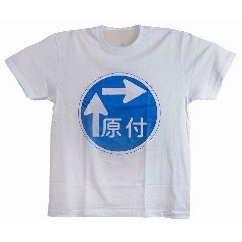 今となってはレアアイテムとなった原付二段階右折指示標識の図柄を、白Tシャツの胸に配置したインパクト大。