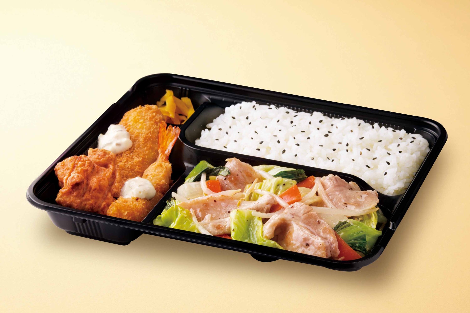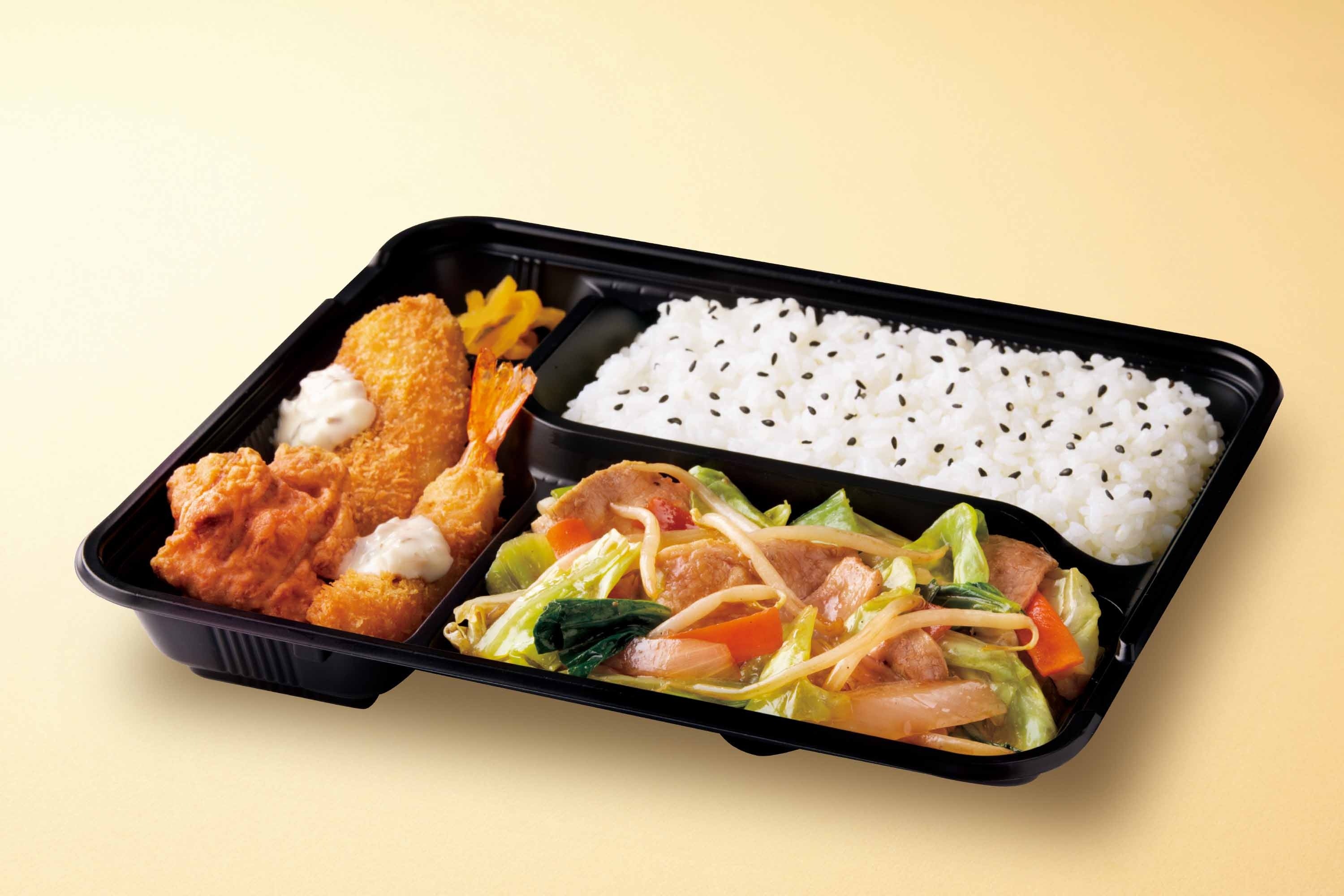 エビフライと唐揚げとミニ白身フライがセットになった「Dx野菜炒め弁当」もご用意しております。