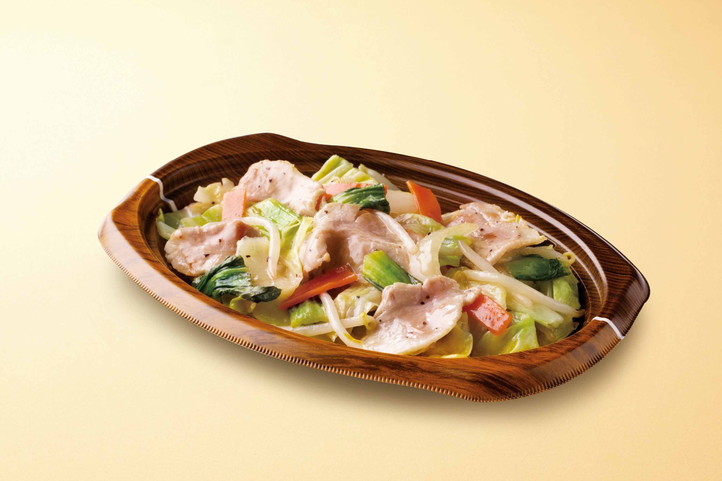 野菜は、5種類(キャベツ・青梗菜・玉ねぎ・人参・もやし)約150g※、肉は豚バラ肉50g※を使用。野菜だけでなくお肉もしっかり食べられる野菜炒めです。