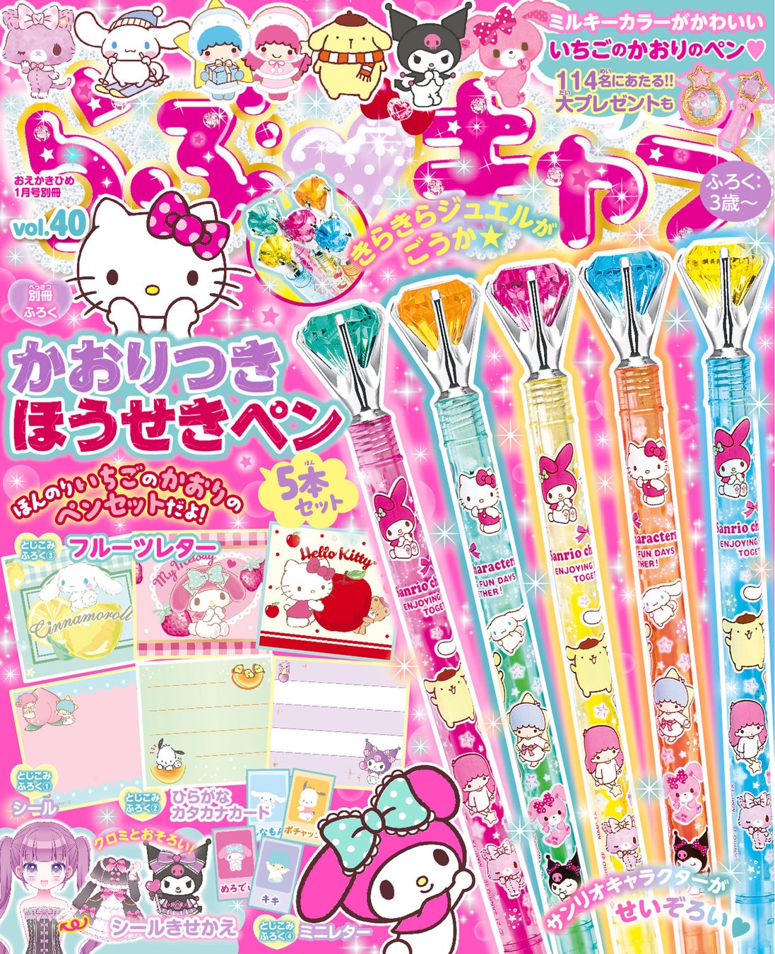 大きなジュエルが豪華! ほのかないちごの香りの「かおりつき ほうせきペン」5本セットが付録の、サンリオキャラクターの児童誌『らぶキャラvol.40』が好評発売中!