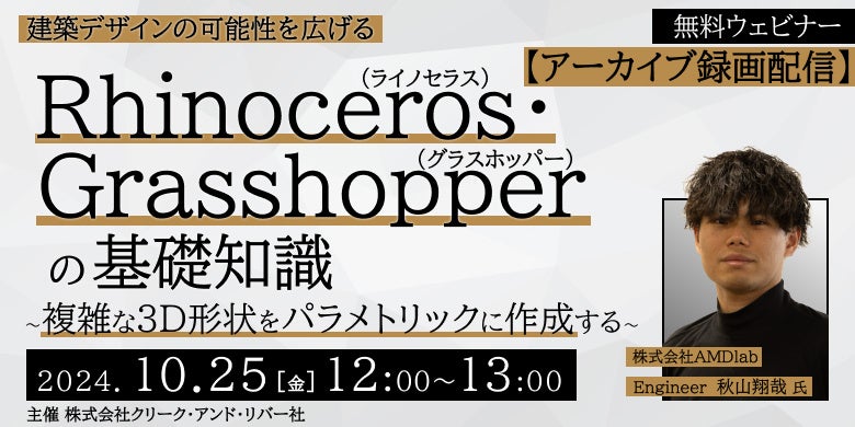 株式会社クリーク・アンド・リバー社(C&R社)は10月25日(金)、今年5月に開催されたオンラインセミナー「建築デザインの可能性を広げるRhinoceros・Grasshopperの基礎知識~複雑な3D形状をパラメトリックに作成する~」のアーカイブ映像を無料配信します。
