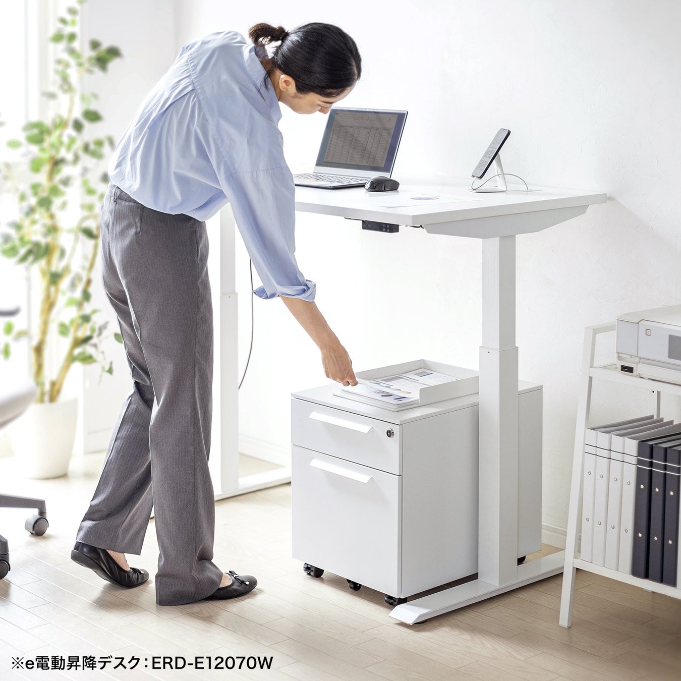 「SNW-105W」は高さが478mmの2段式です。高さが一般的なデスクキャビネットより少し低いので、デスク下に置いても間隔に余裕があり、キャビネット天板上に書類受けなどのトレイを置けます。昇降デスクでの立ち作業で使用する時も、キャビネットの上に置いた書類などが取りやすく便利です。