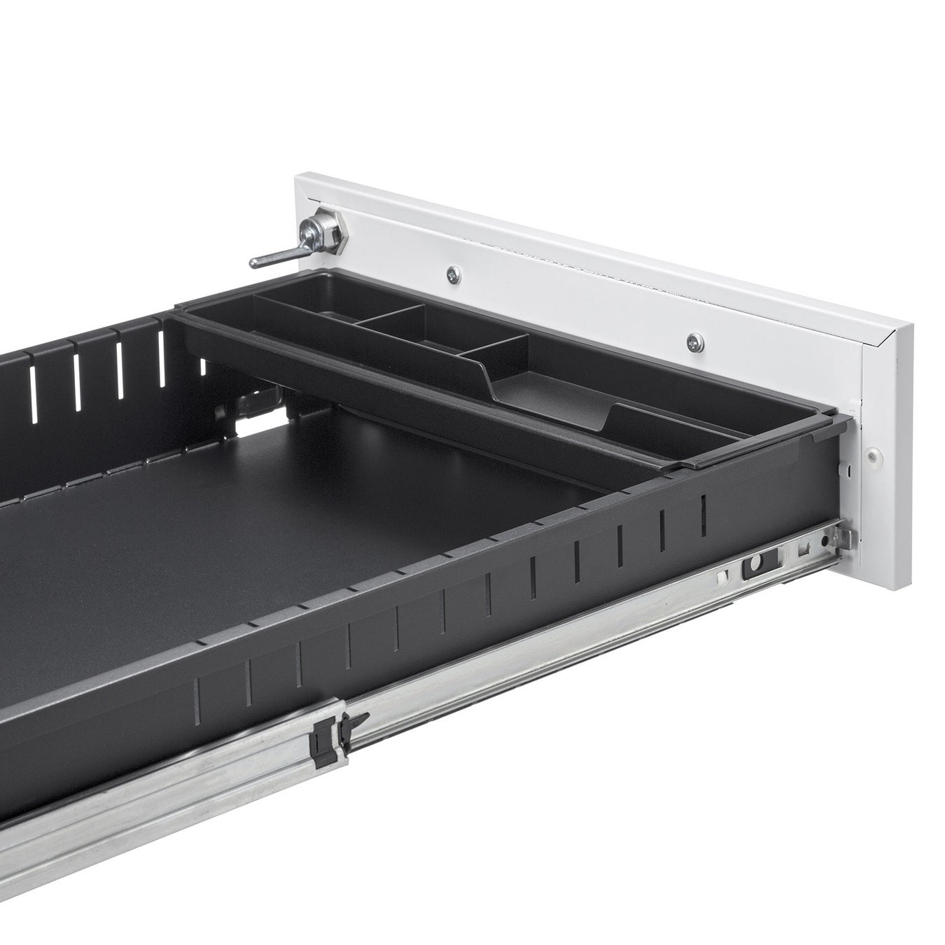 両シリーズとも引き出し上段にはペントレーが付属します。引き出し下段には仕切板が付属し、A4ファイルの収納に便利です。また、ダブルスライドレールを使用しており、引き出しのほぼ全体を引き出せます。全ての引き出しを一括で施錠・解錠することもできます。