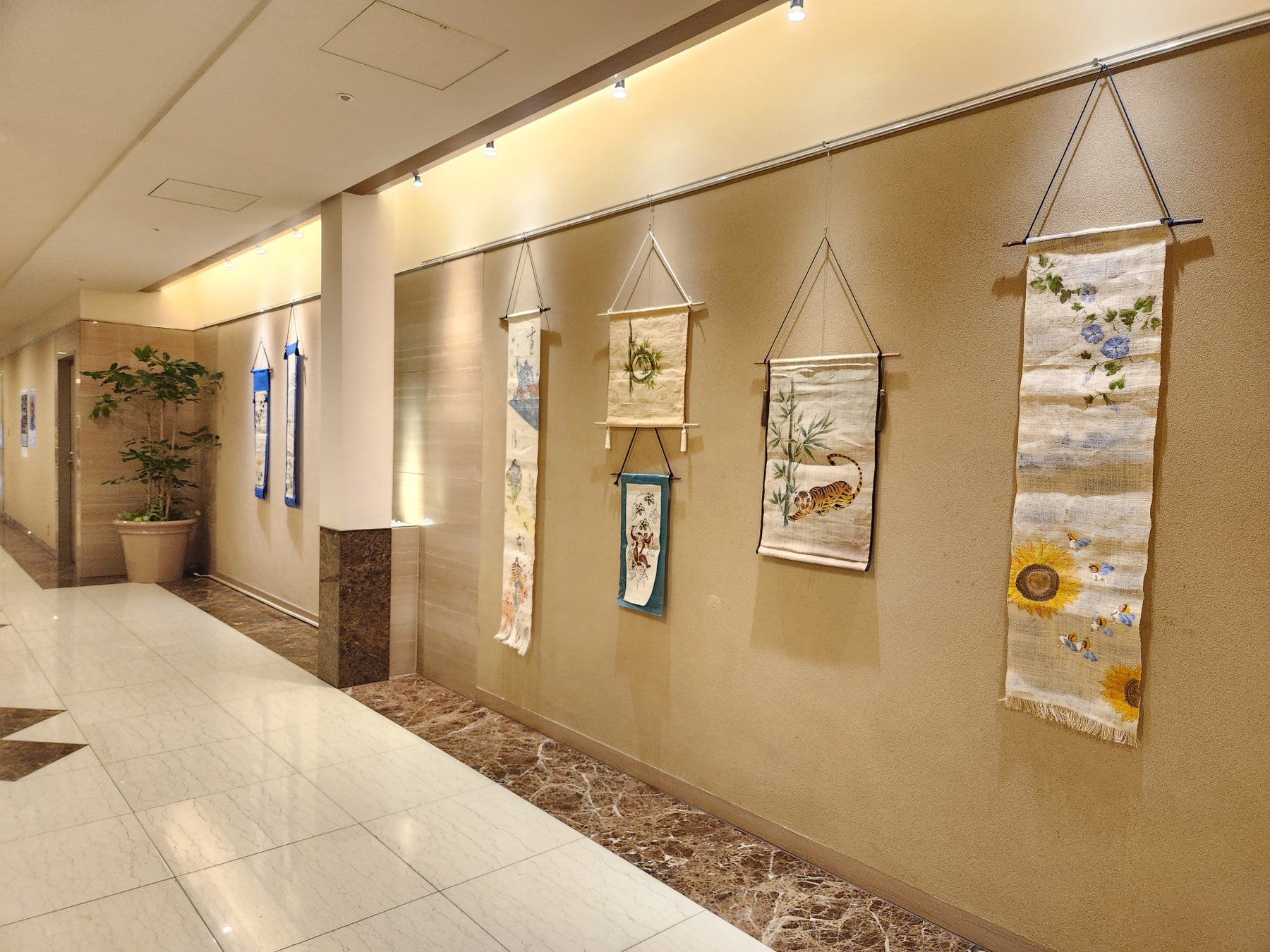2022年2月よりホテル2階の通路スペースをギャラリーとして活用した展示は、地域の方のご協力を得て14回目を迎えます。『手描き友禅タペストリー作品展』では、泉佐野市在住の新日本和装協会認定・友禅講師として活躍する菊 桂子氏(以下、菊氏)の大小の手描き友禅タペストリー作品32点を展示いたします。