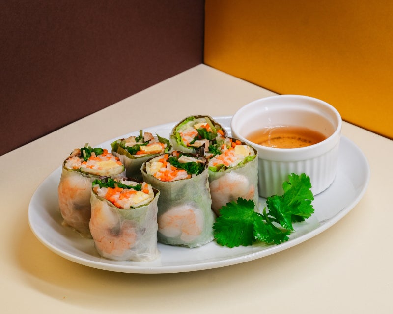 ライスペーパーで新鮮な海老やお肉と、レタスやきゅうり、パクチーなどたっぷりの新鮮な野菜を巻いています。ベトナム風スイートチリソースを絡ませると、エスニックな風味とほどよい辛みが食欲をそそります。