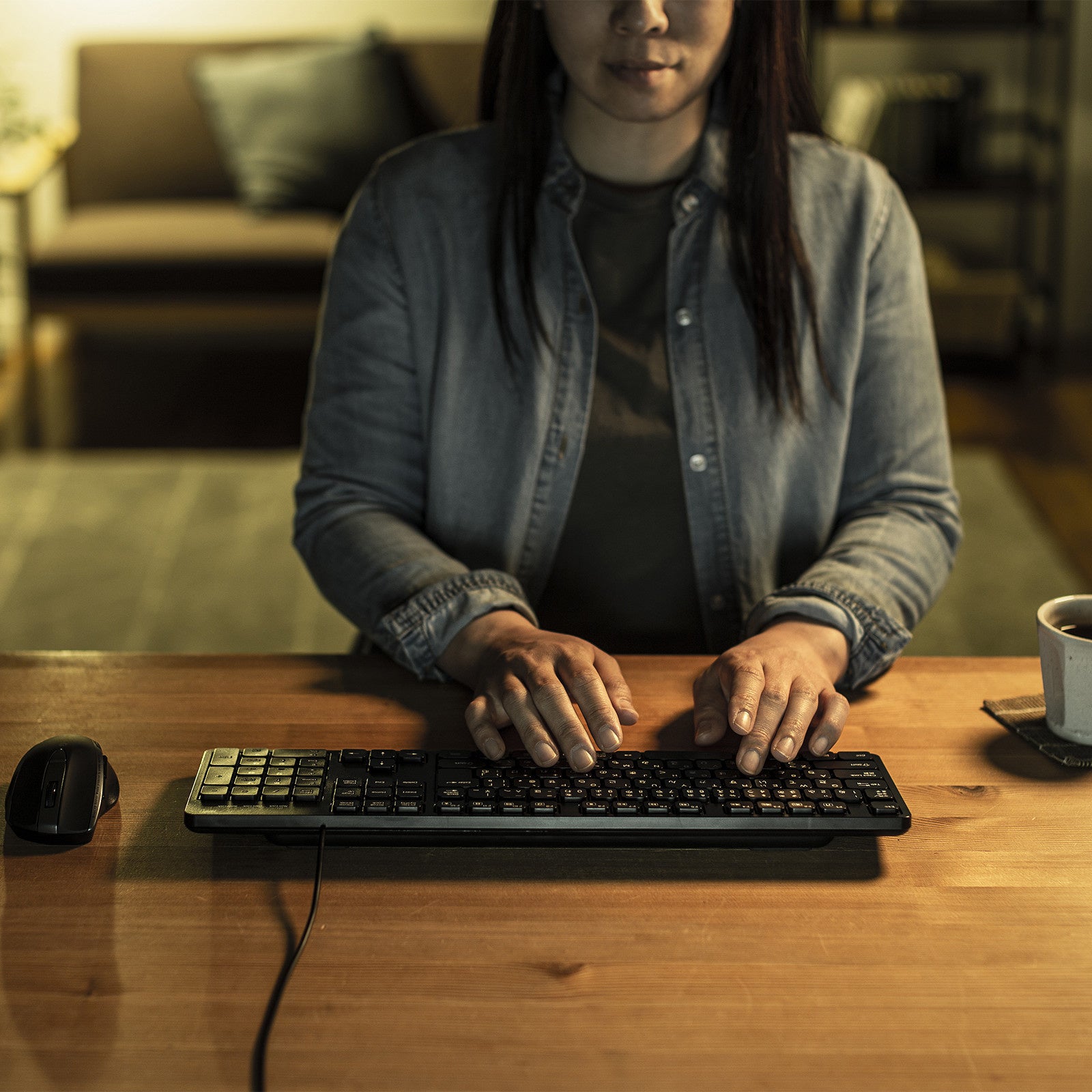 従来のメンブレンキーボードと比較してキータッチ音が格段に小さくなり、深夜のパソコン作業や公共施設など、入力音が気になる場所での使用に最適です。また、キースイッチは薄型メンブレンタイプを採用しており、軽快なキー入力が可能です。