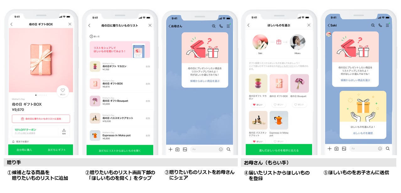 「母の日に贈りたいものリスト」は、ギフト候補となる商品を選定しリストとしてストックできる期間限定の機能です。登録した商品が一覧で見られるため、候補を絞ってからじっくり選ぶことが可能です。また、「何を贈ろう?」「いつも同じようなものになってしまう」という方は、この機能を使うことで、気軽にお母さんにほしいものを聞くことができます。まず、贈り手はギフト候補となる商品を「母の日に贈りたいものリスト」に追加、LINEのトークでお母さんにシェアします。そして、お母さん(もらい手)はリストの中から欲しいものに“♡ほしい(ほしいボタン)”を押し、「ほしいものを相手に伝える」を選択することで、ほしいものを贈り手に通知することが可能です。お絶対に外さないギフト選びをサポートするほか、お母さんとなかなか会話する時間が取れない中で、コミュニケーションを取り合う手段の一つとしても活用いただくことができます。