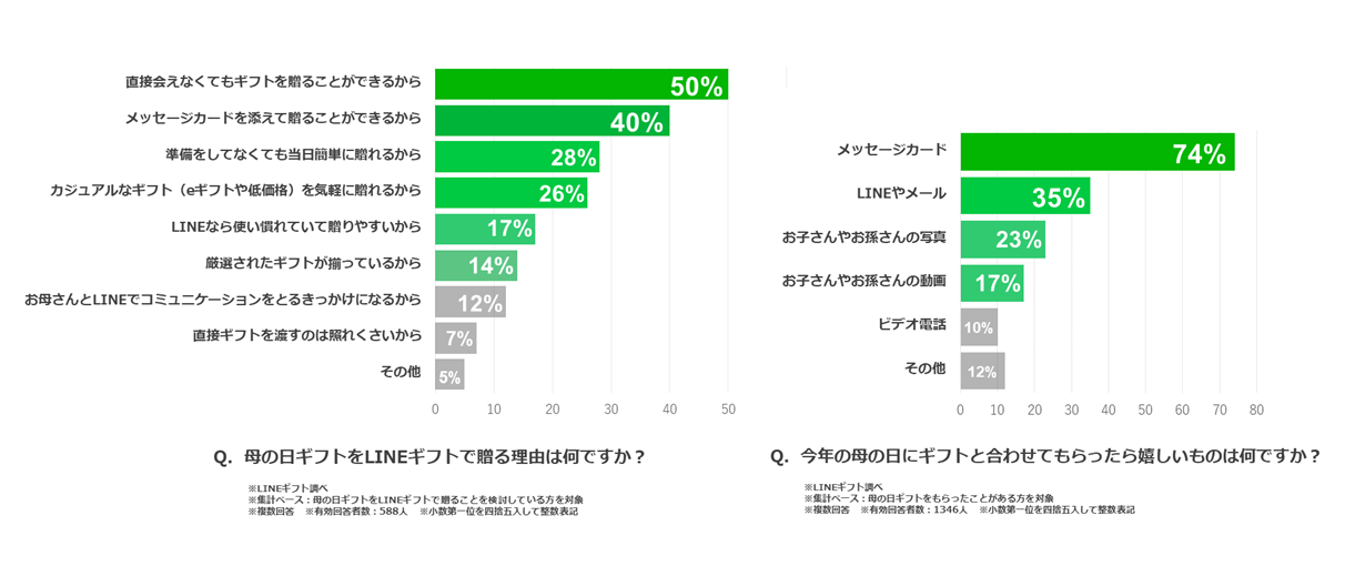 母の日に関するアンケートでも、母の日ギフトをLINEギフトで贈る理由2位が「メッセージカードを添えて贈ることができるから」となっており、LINEギフトならではのメッセージカードが、ギフトを贈る上で大きな役割を担っていることがうかがえます。また、「お母さんがもらって嬉しい母の日ギフト」3位、「母の日にギフトと合わせてもらったら嬉しいもの」1位がメッセージカードということから、間違いなく母の日にお母さんに喜んでもらえるアイテムだということが分かります。