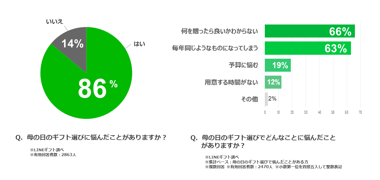LINEギフトが行った母の日に関するアンケートでは、86%の方が『母の日のギフト選びに悩んだことがある』と回答し、『何を贈ったら良いかわからない』『毎年同じようなものになってしまう』という悩みを抱えた方が多いことが分かりました。