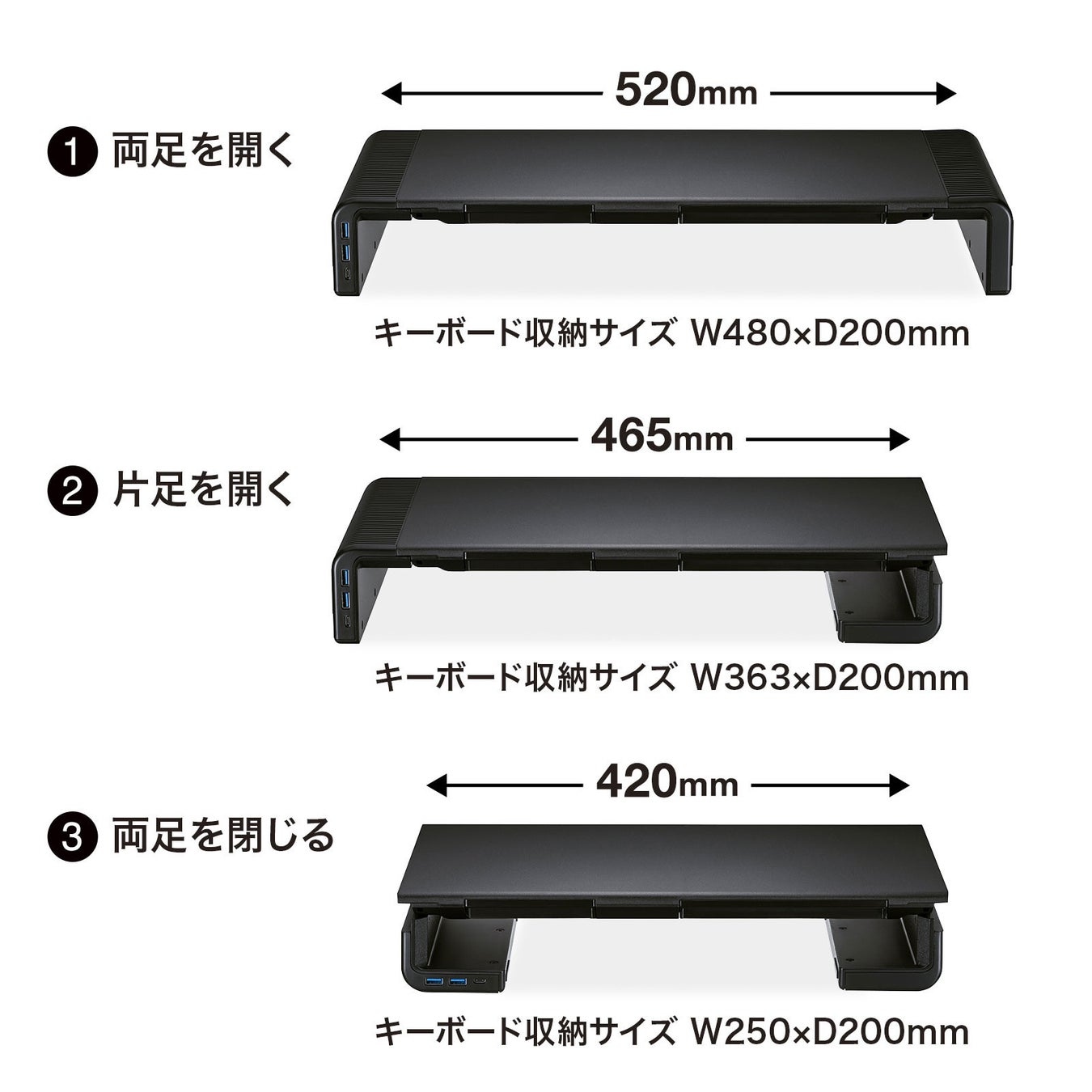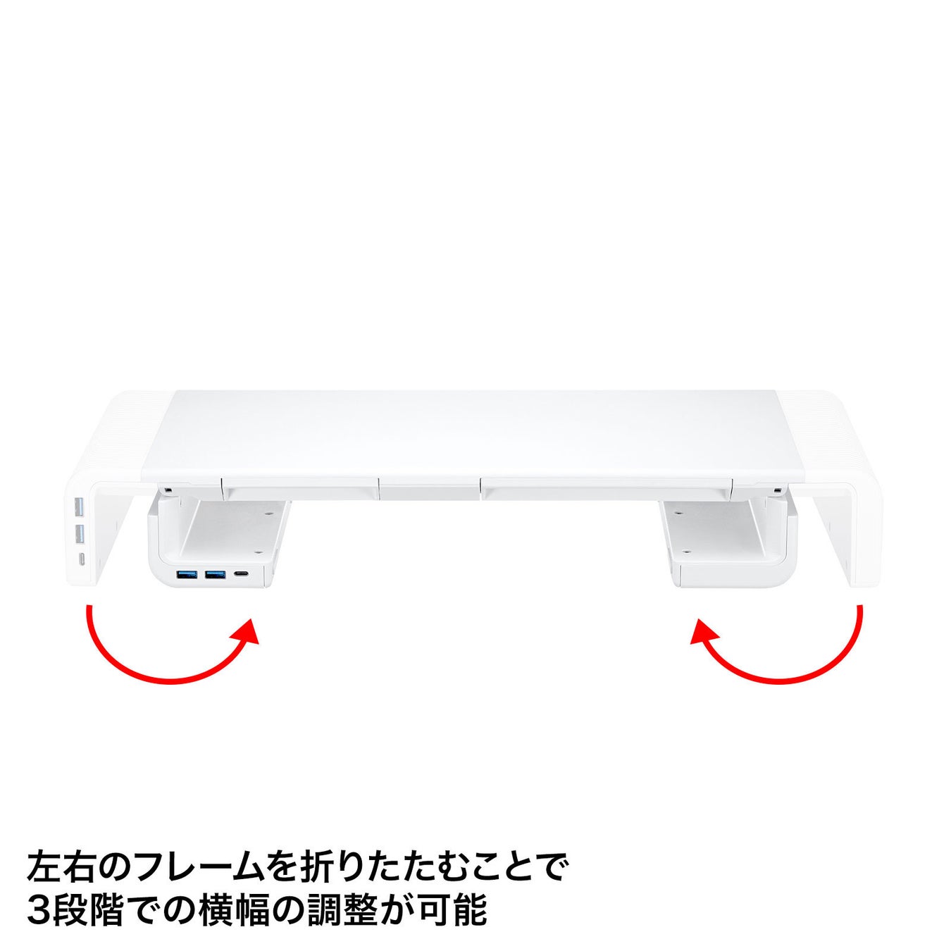 左右のフレームを折りたたむことで3段階での横幅の調整ができます。デスクやディスプレイサイズによって机上ラックのサイズを合わせることが可能です。