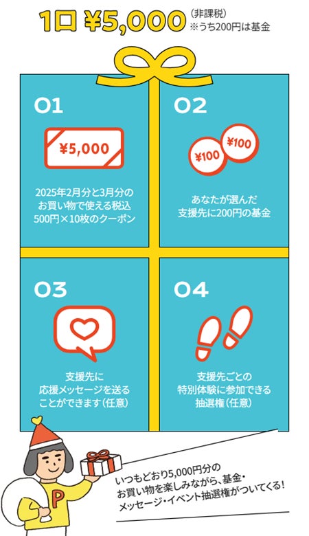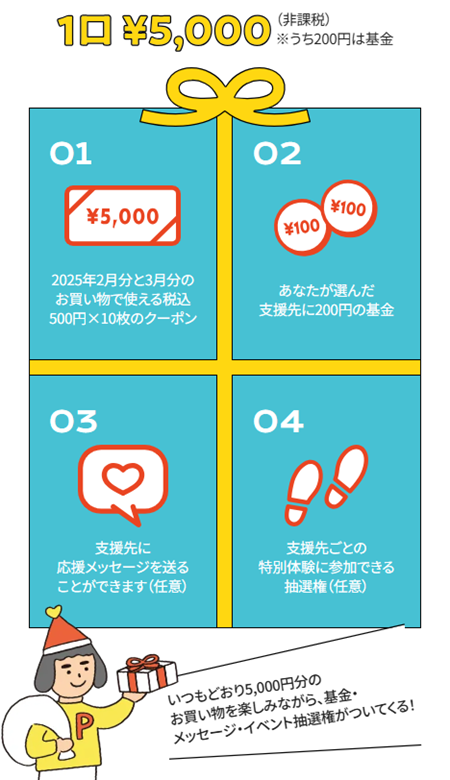 1口¥5,000(うち¥200は基金)で応援したい活動を選んで購入します。申し込み1口につき【フェリシモ定期便専用お買い物クーポン500円×10口】が届きます。