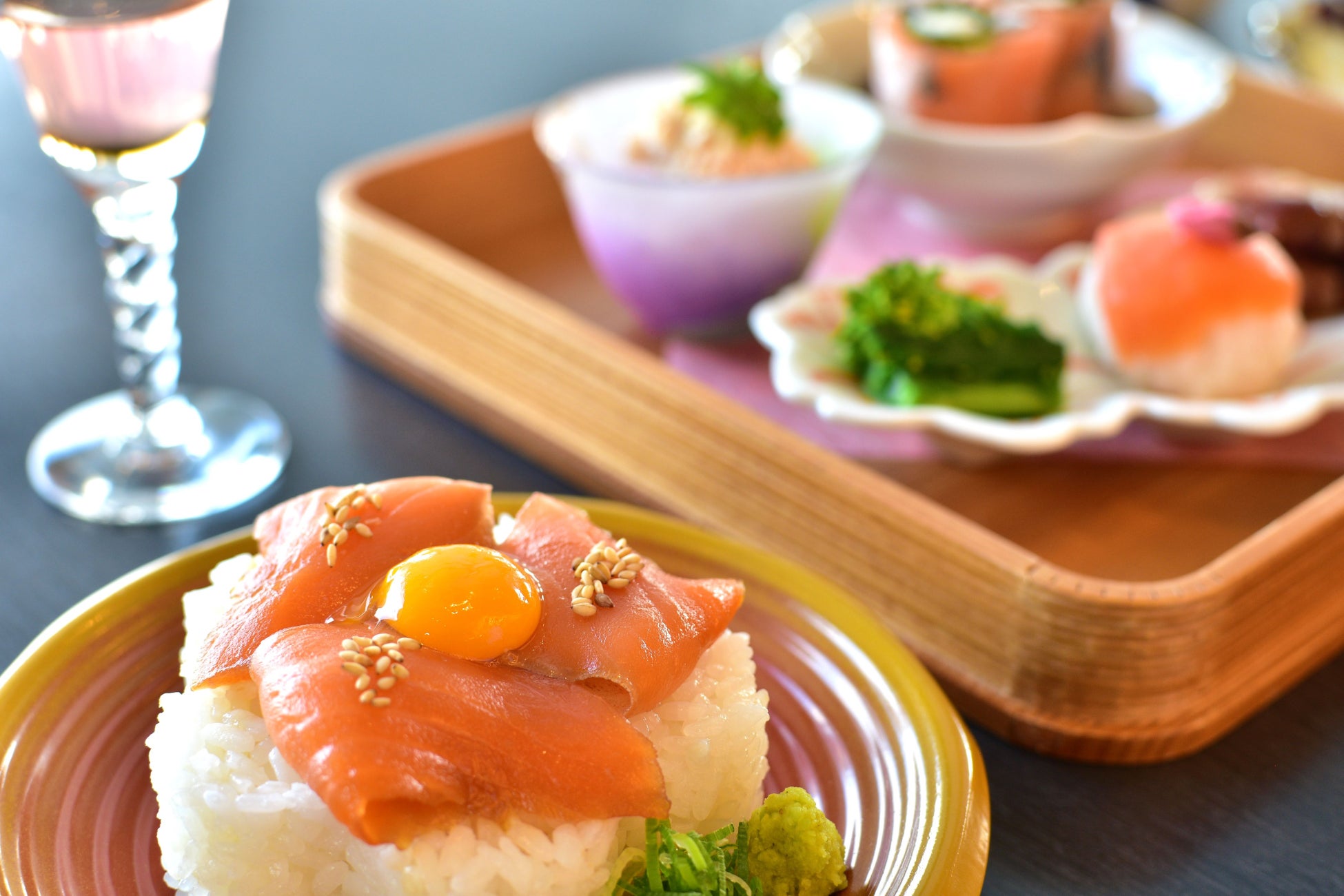 日本料理「あわみ」でご提供する淡路島サクラマス春御膳「花霞」は、桜香る華やかな手まり寿司、サクラマスの刺身と淡路島の新玉葱などの春野菜を合わせた生春巻き、淡路放し飼いたまごとサクラマスの味わい豊かな茶碗蒸しやサクラマスのレアカツなど、5種類のサクラマス料理をご堪能いただけます。その中の一皿「淡路島サクラマス漬け御飯」は、サクラマスの旨味が詰まった特製だれにサクラマスを漬けて濃厚な旨味を引き出しています。