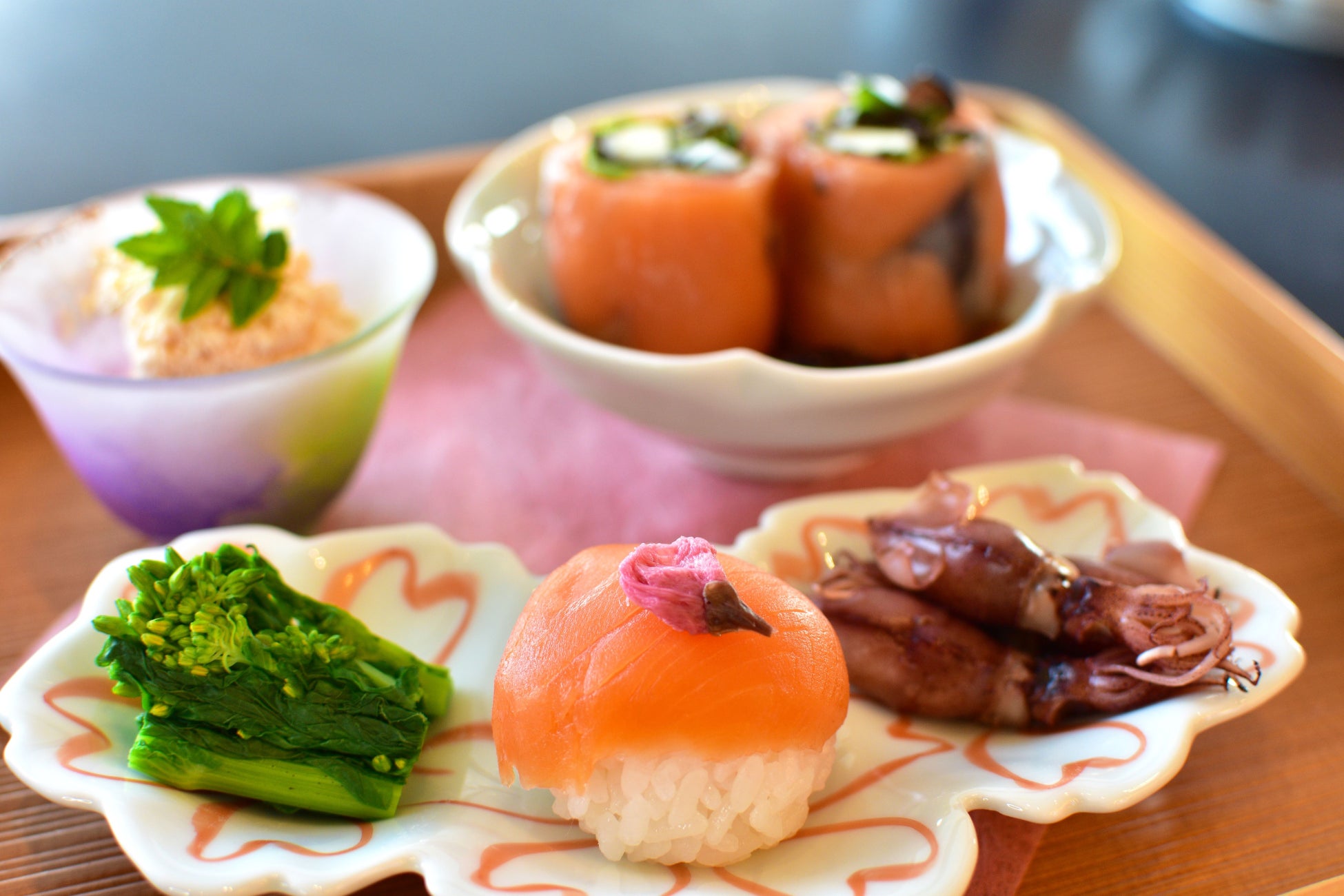 取肴:淡路島サクラマス手まり寿司 桜の花塩漬け / 淡路島サクラマス生春巻き ぽん酢ジュレ 淡路産玉葱 レタス チーズ スナップエンドウ フライドオニオン /ほたるいかスモーク / 菜の花 / 鯛の子旨煮