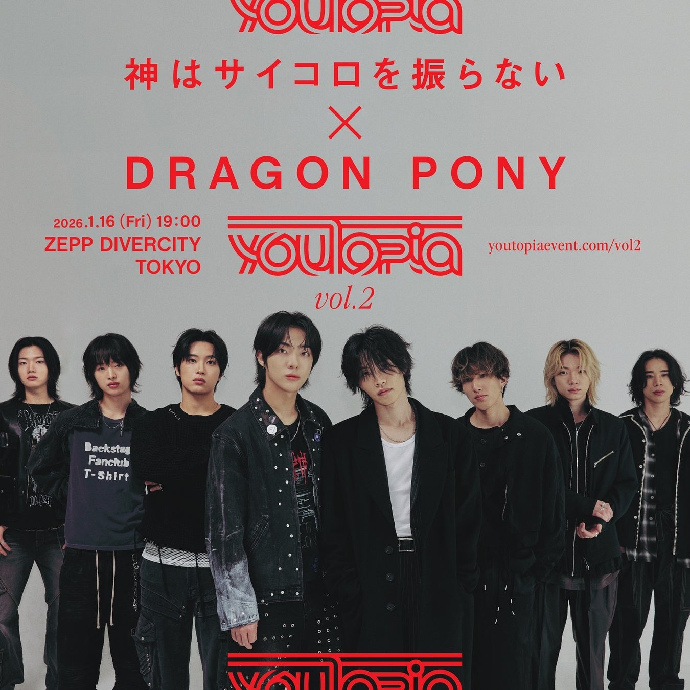 2025年11月22日(土)・23日(日)・韓国ソウルのMYUNGHWA LIVE HALL、2026年1月16日(金)・東京Zepp DiverCityにて、「youTopia vol.2 神はサイコロを振らないxDRAGON PONY」を開催することが決定しました。
