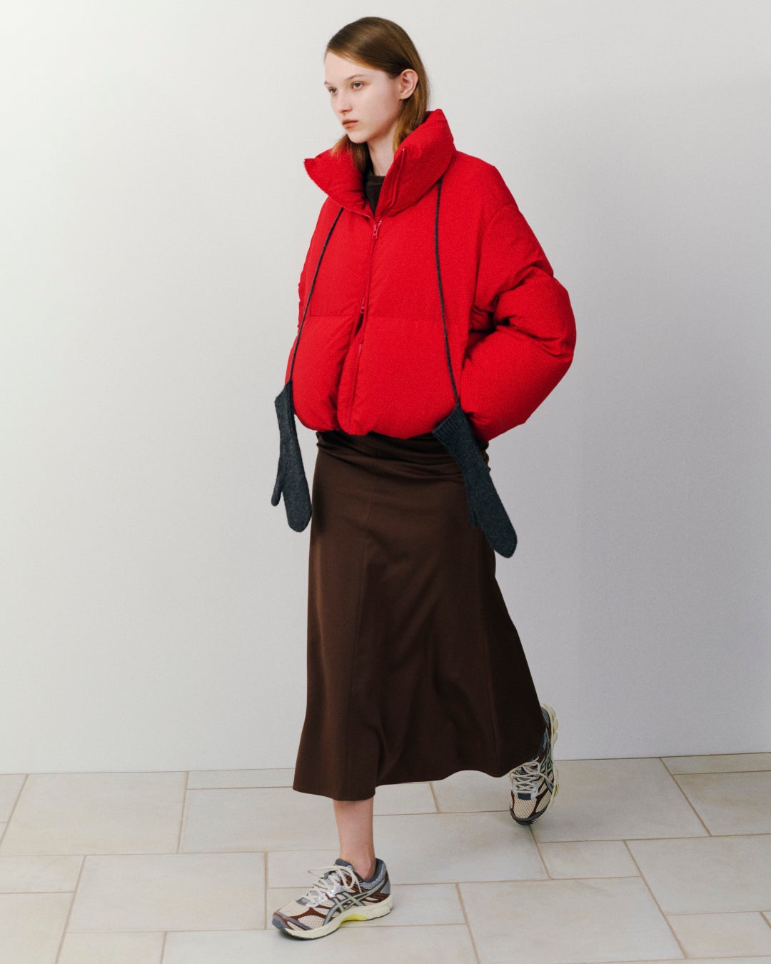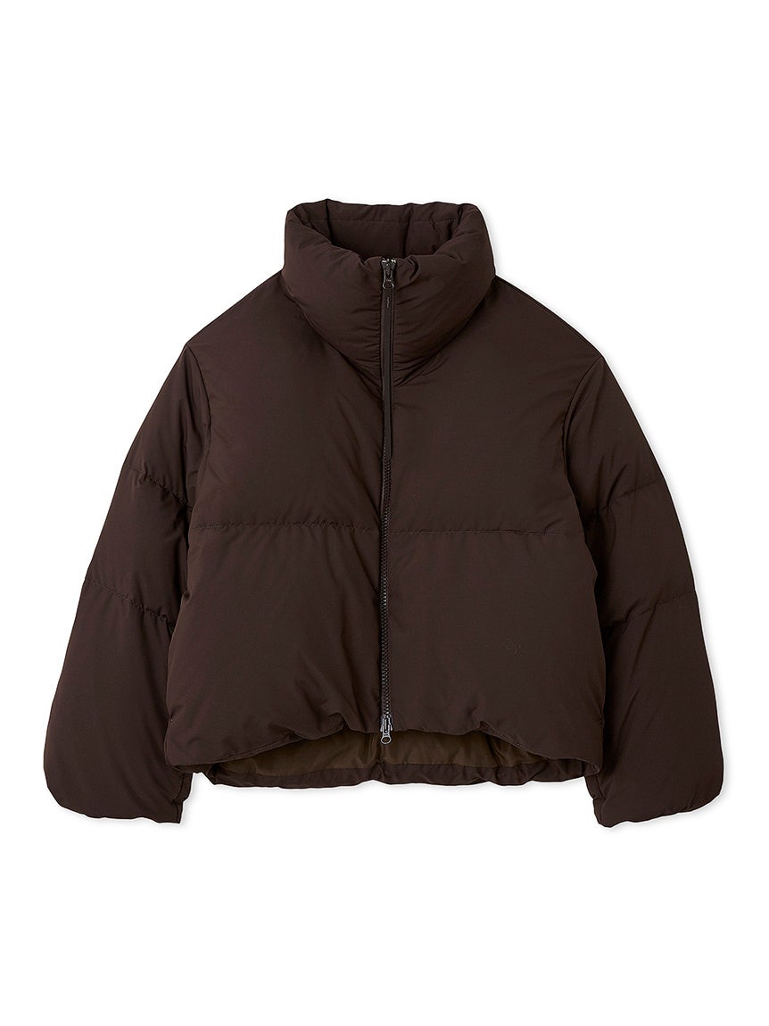 表地に水を滑らせて雨をよける撥水ファブリック『MINO TECH(ミノテック)』を使用。内側には地球に優しいリサイクルダウンを贅沢に使用し、高さのある首元とボリュームたっぷりのフォルムに仕上げました。袖口のemmiロゴがポイントです。トレンドの深みのあるブラウンはオンライン/オープン店舗限定カラーです。