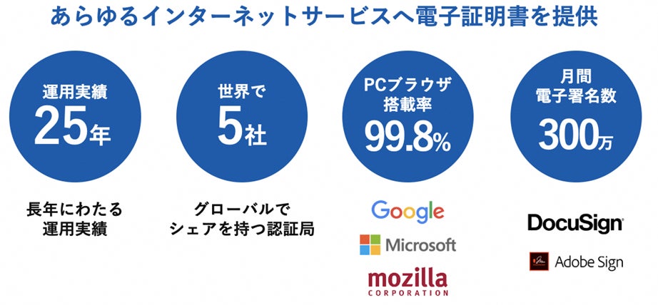 11万社の法人のサーバー運用実績、国内販売代理店 約6,800社の販売代理店を有するホスティング事業者であり、世界で5社しかないグローバルでシェアを持つ電子認証局の中で唯一の国産認証局「GlobalSign」を保有。政府関連機関・大手企業をはじめ世界各国の企業・団体に電子証明書を導入しています。