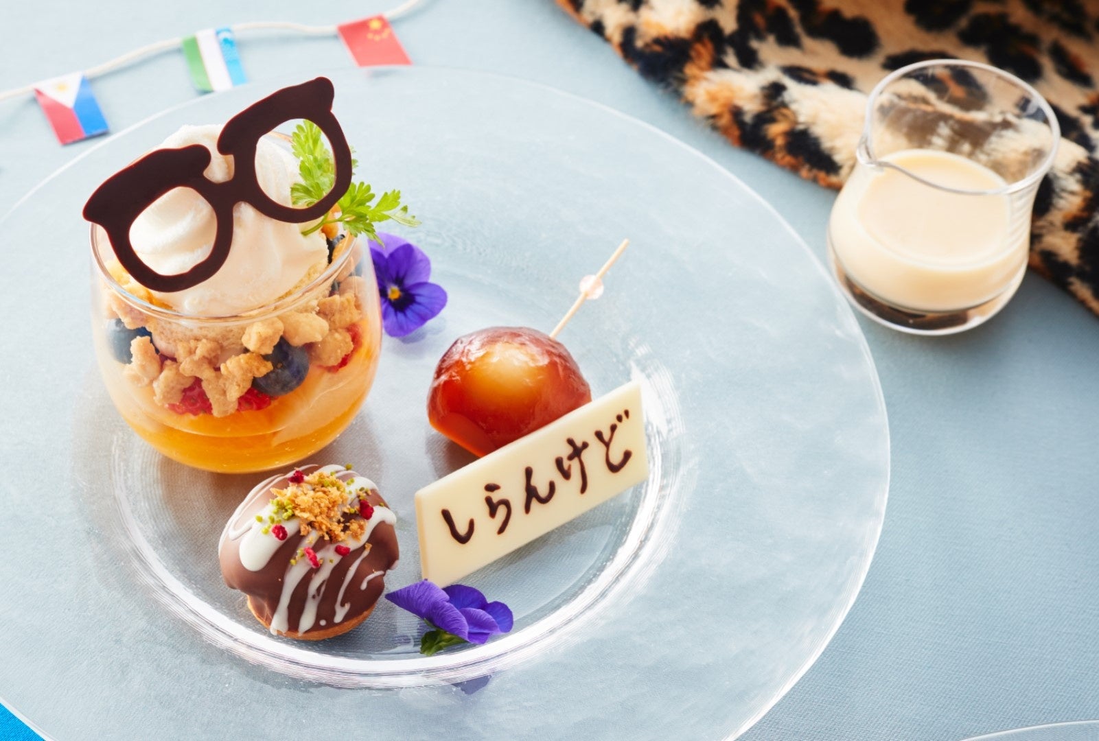 オリジナルドリンクは、心斎橋が発祥と言われる冷やしアメをイメージした、ジンジャー香るまろやかな一品。スイーツは、大阪産みかんのジュレや大阪産不知火(しらぬい)などをつかったミックスジュース風味のクープ(グラスデザート)や、たこ焼きに見立てたシュー、大阪産はちみつのマドレーヌ、アイスキャンデー風あずきムース、お城最中フロランタンなどをご用意し、「しらんけど」「OSAKA」のチョコレートプレートで飾ります。