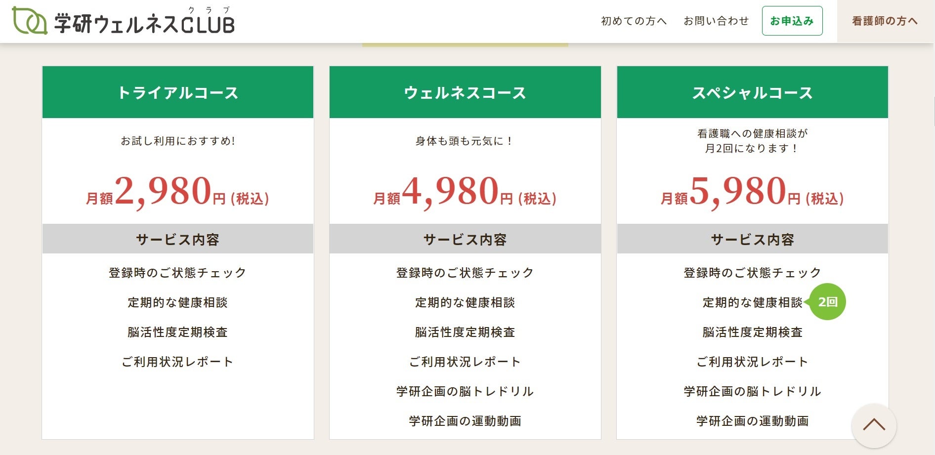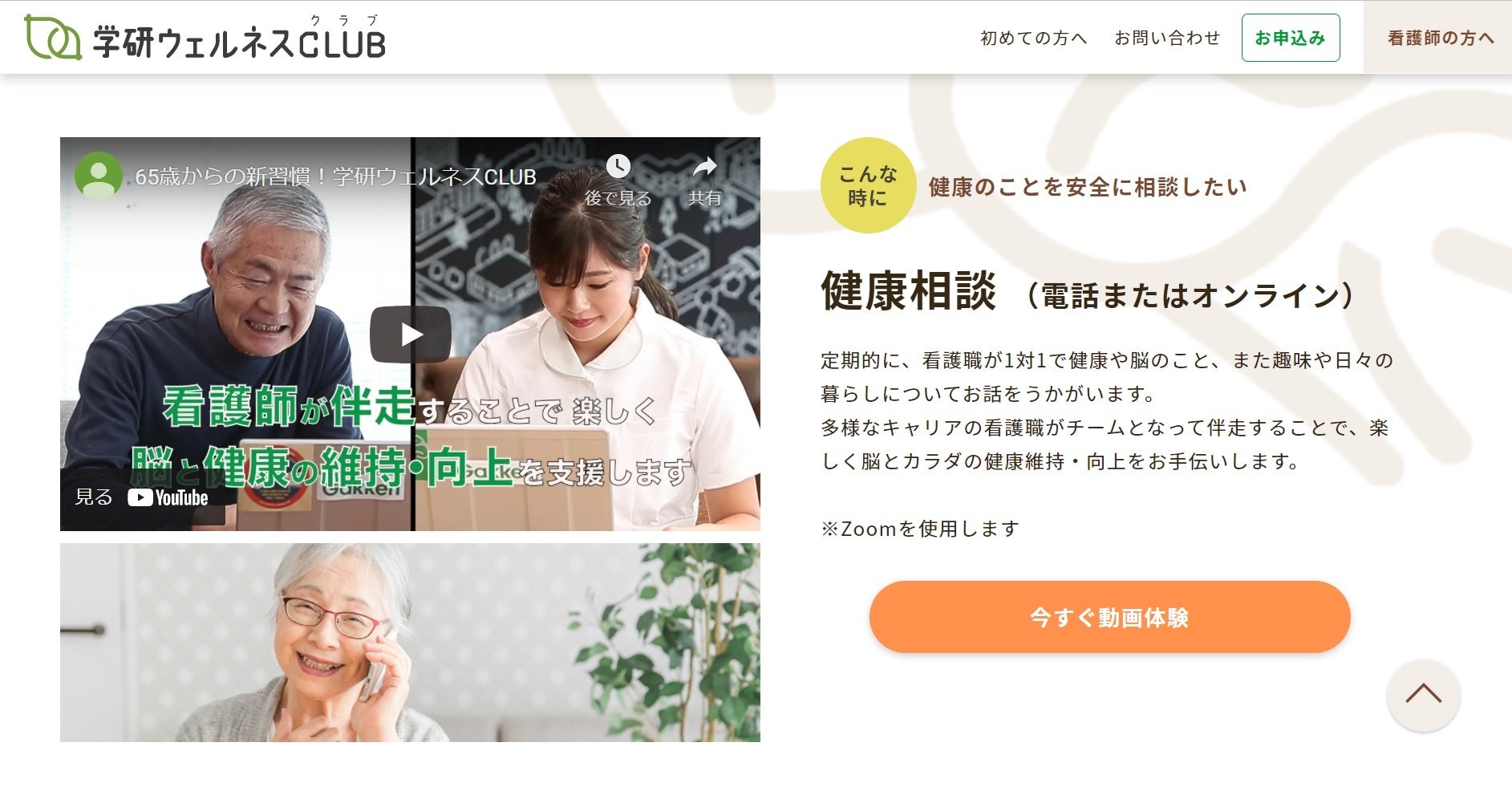 認知症専門医が推薦!認知機能を鍛えるための、習慣化と健康づくりを看護職がサポートするサービスです。3つのコースからお選びいただくことができます。内容に含まれる脳トレドリルや運動動画は学研で制作・開発したものを使用。また、入会時の認知症リスクチェックや脳活性度定期検査で客観的に状況を把握できます。