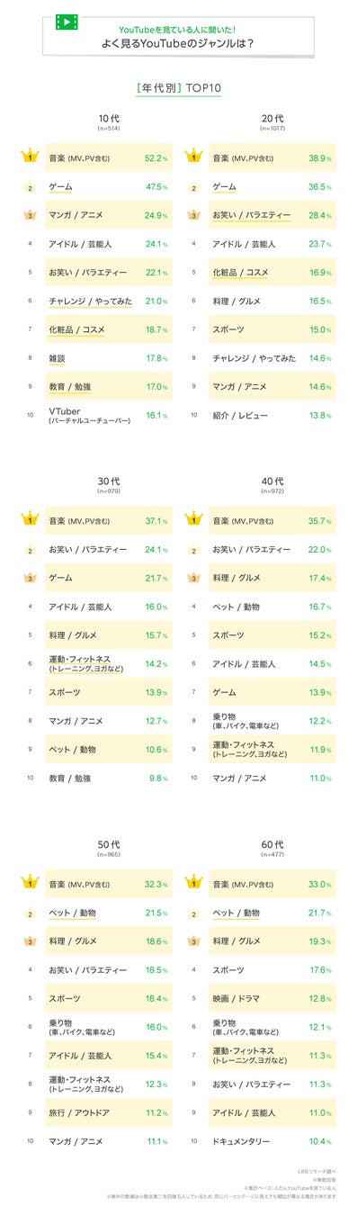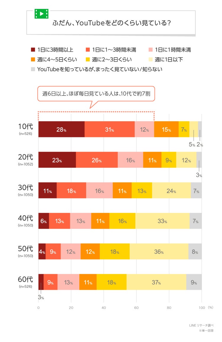 【LINEリサーチ】10代では約7割、20代では6割超がYouTubeをほぼ毎日見ていると回答 よく見るジャンルは「音楽」がすべての年代で1位