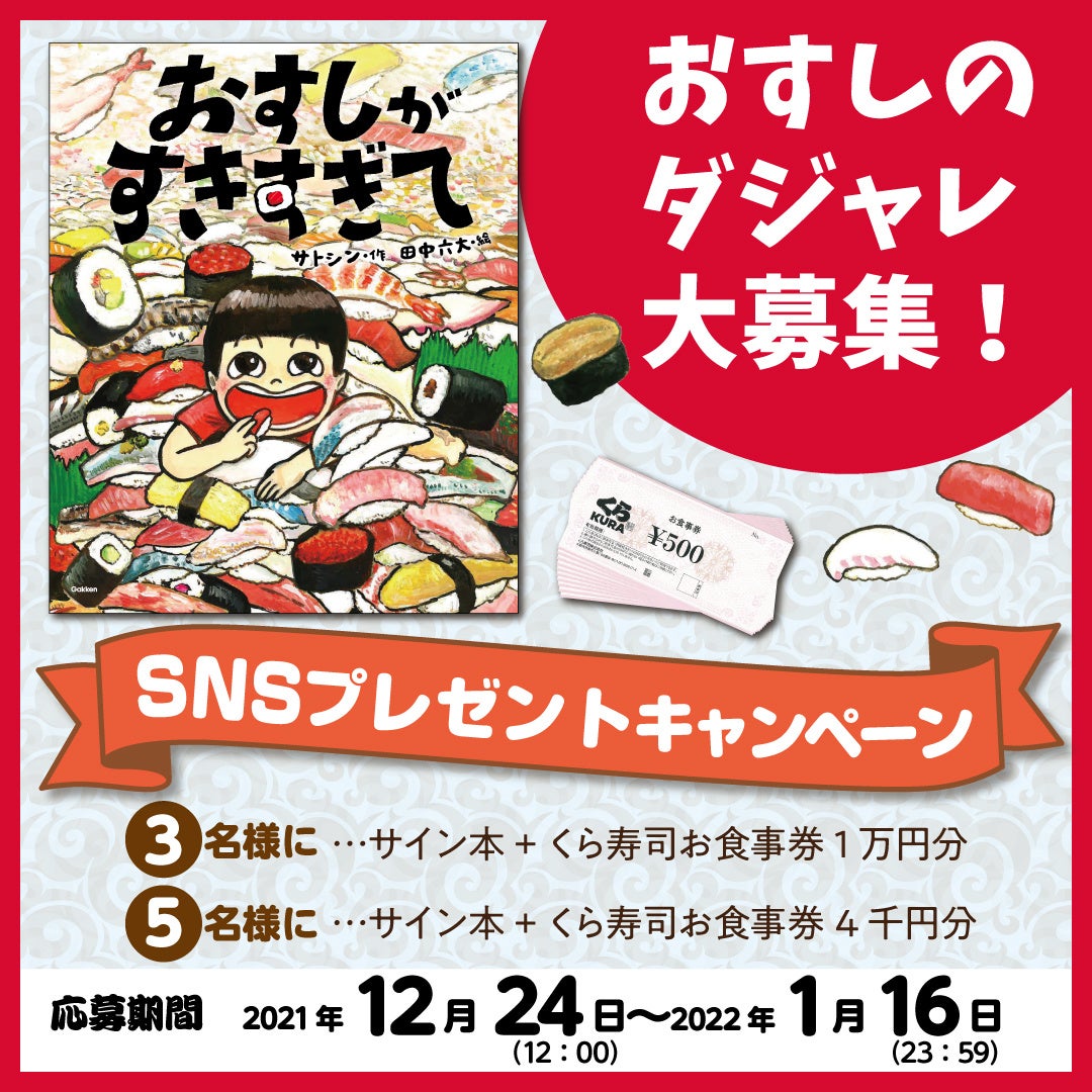 人気絵本作家・サトシン×田中六大の最新刊『おすしがすきすぎて』発売記念!「おすしダジャレ大募集! サイン本&くら寿司お食事券プレゼントキャンペーン」を開催します!〆切2022/1/16(日)