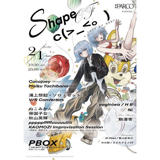 ライブや特別展示、KAOMOZIメンバーによる即興セッションに加えて、ゲストアクトとして浦上想起、V/R Converters、Cocojoey、 Maiku Tachibanaが出演。