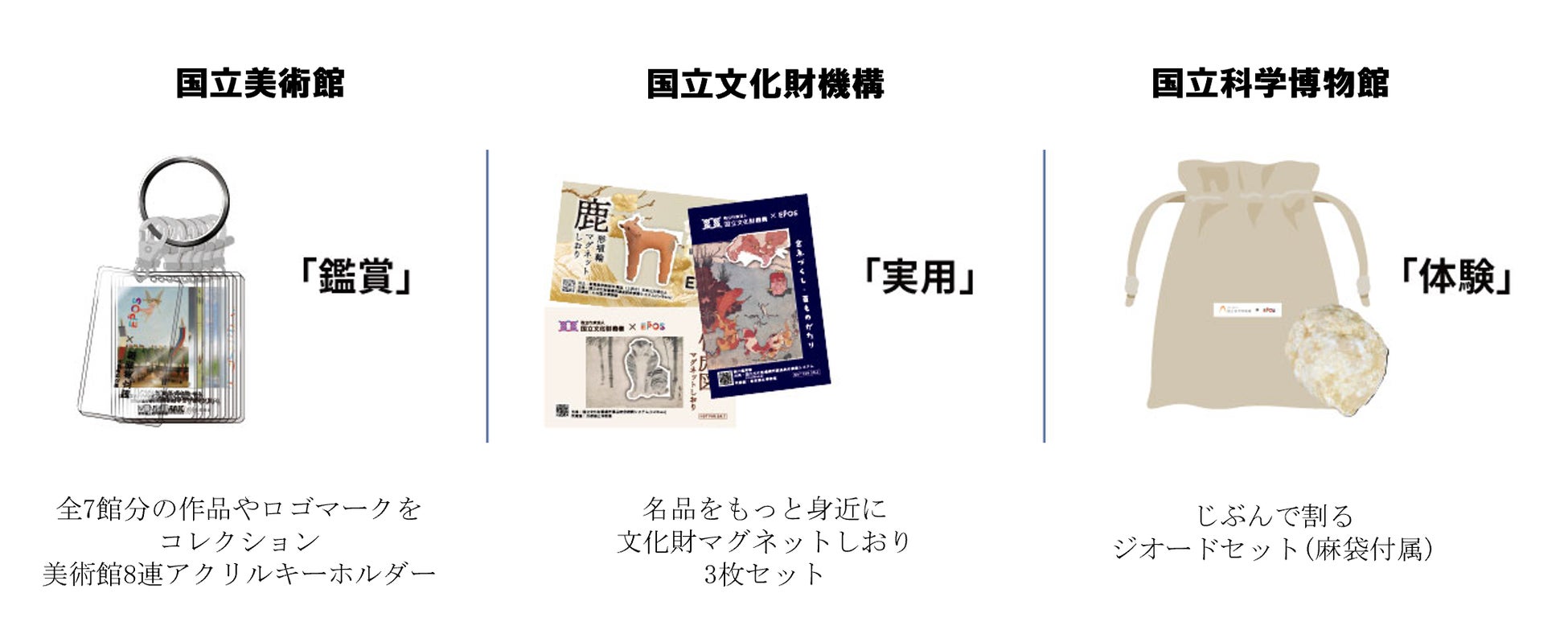 入会後3カ月以内に税込30,000円以上ご利用いただいたお客さまには、選んだ券面デザインごとの「ミュージアム」をイメージした特典をプレゼントいたします。例えば美術館では「鑑賞」を楽しみに来館される方が多いことから、国立美術館7館それぞれが選んだビジュアルを起用したアクリルキーホルダーにするなど、3法人それぞれファンの皆さまの志向に応える特典となっています。