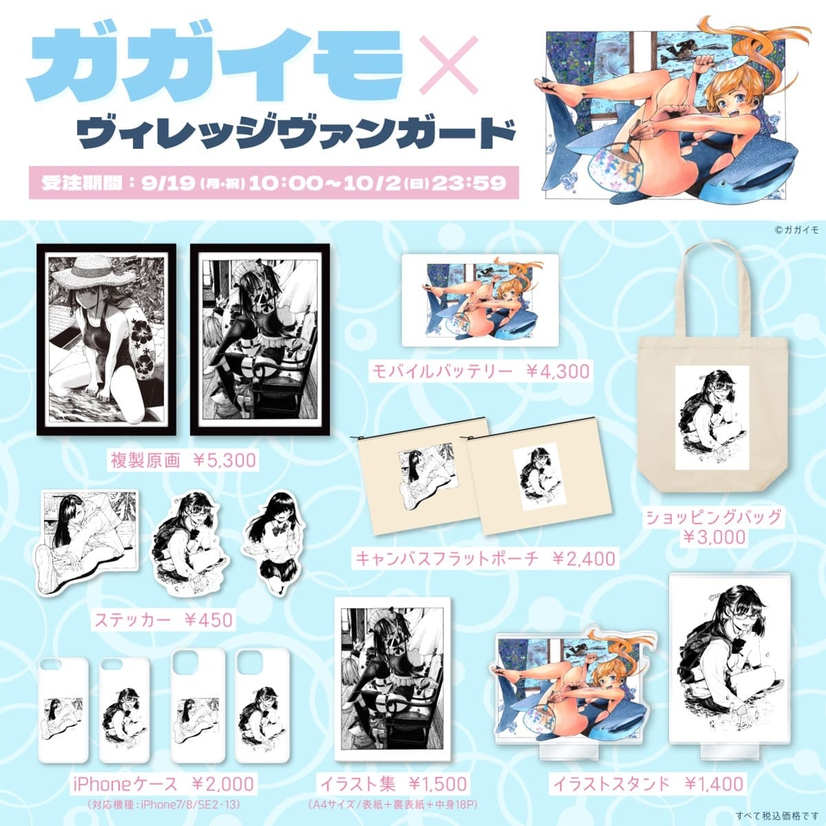 魅力的な女の子たちに思わず目を奪われる、ガガイモさんのイラストが映える素敵なグッズができました。じっくりイラストを鑑賞したい方は複製原画やイラスト集を、お好きなイラストと過ごしたい方はポーチやバッグを!色々選べて迷っちゃう!期間限定の完全受注になりますので、この機会を逃がすな~!