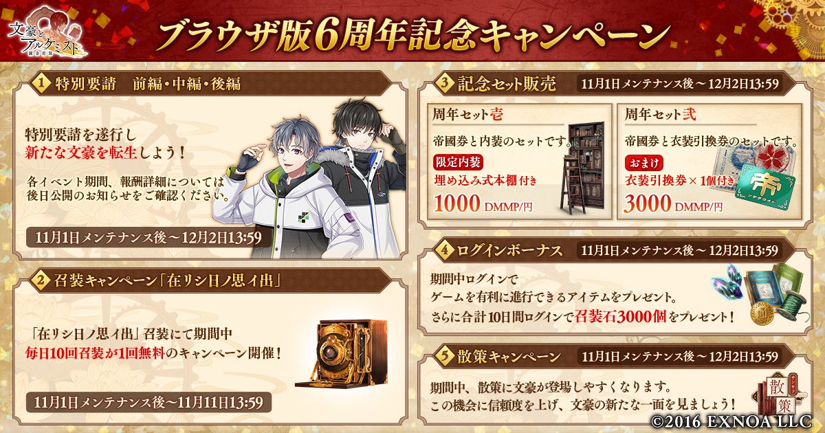 合同会社EXNOA(本社:東京都港区、CEO:村中 悠介、URL:https://games.dmm.com/)が運営するDMM GAMESは、11月1日(火)より、女性向け文豪転生シミュレーションゲーム「文豪とアルケミスト」において、6周年を記念した各種キャンペーンを開始いたしました。