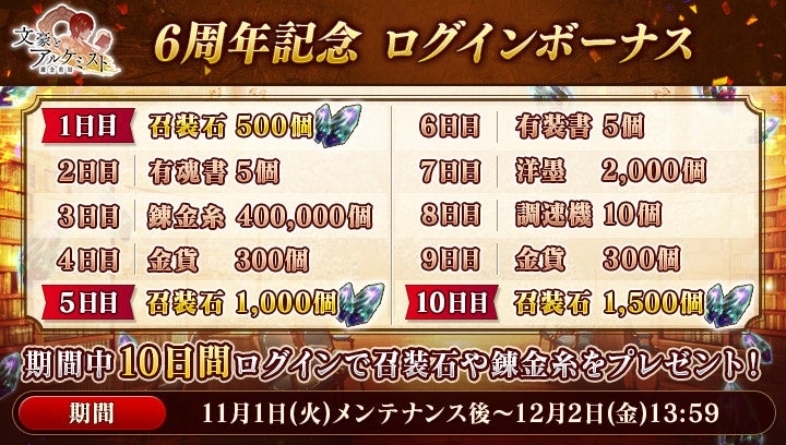 6周年を記念して、期間中ログインすると最大で召装石3000個(召装10回分)や錬金糸など豪華アイテムをプレゼント!