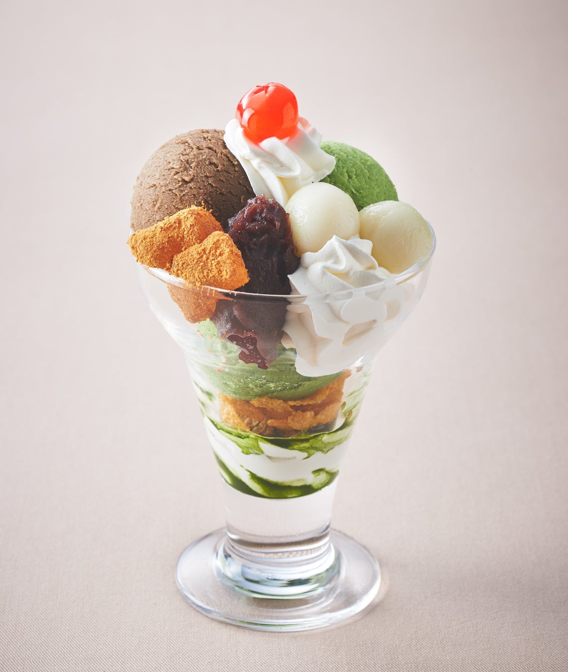 抹茶アイス、ほうじ茶アイス、こし餡に白玉、わらび餅など9種の具材を使い、ほろ苦さと程よい甘さを感じる、和の風味満載の一品です。グラスの底のコーンフレークと生クリーム、抹茶ソースまで、飽きることなく抹茶の味わいをお楽しみいただけます。