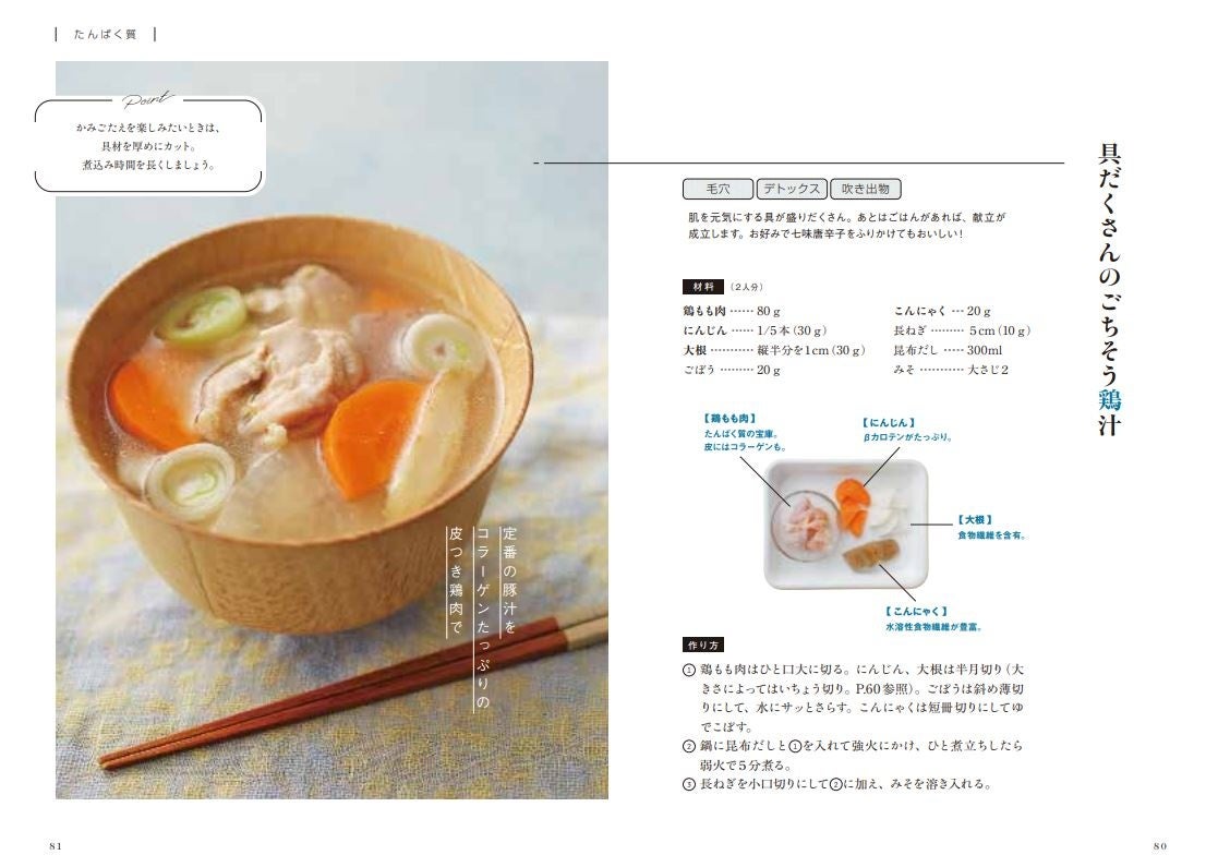さらに後半では、具だくさんでおなかも満足する「おかずみそ汁」や、炭水化物も一緒にとれる「主食みそ汁」、電子レンジでできる「レンチンみそ汁」など、バリエーション豊かに紹介。いずれも美肌に役立つ食材がしっかり入ったみそ汁です。