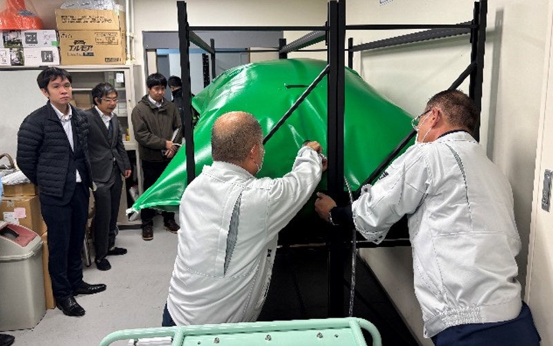 各機関には、本学が事前にヘリウムガス回収用圧縮機1台とヘリウムガス回収用ガスバッグ10個を納品しており、当日は、NMR装置とガスバッグを専用のホース等で接続する作業や回収用圧縮機の試運転等を行った後、NMR装置からガスバッグへのヘリウムガスの回収を開始しました。