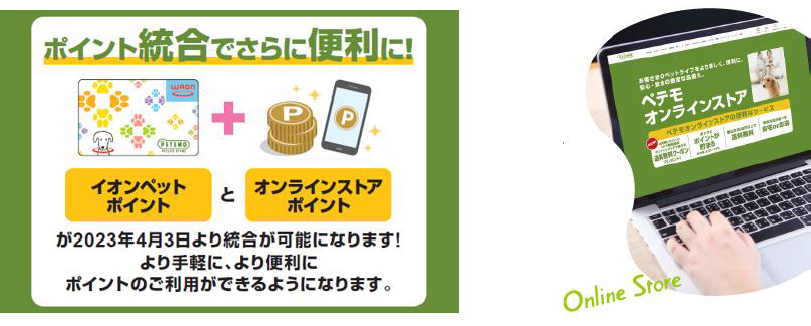 イオンペット株式会社(代表取締役社長:米津一郎、以下イオンペット)は、4月3日(月)より、全国のペテモの店舗・グルーミングサロン・動物病院で使える『イオンペットポイント』と、ペテモの公式ECサイト「ペテモオンラインストア」・「ペテモ動物病院オンラインストア」で使える『オンラインストアポイント』の統合が可能になります。