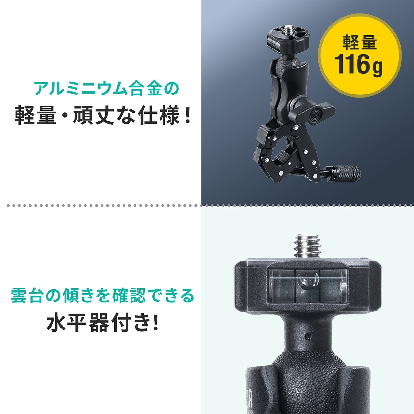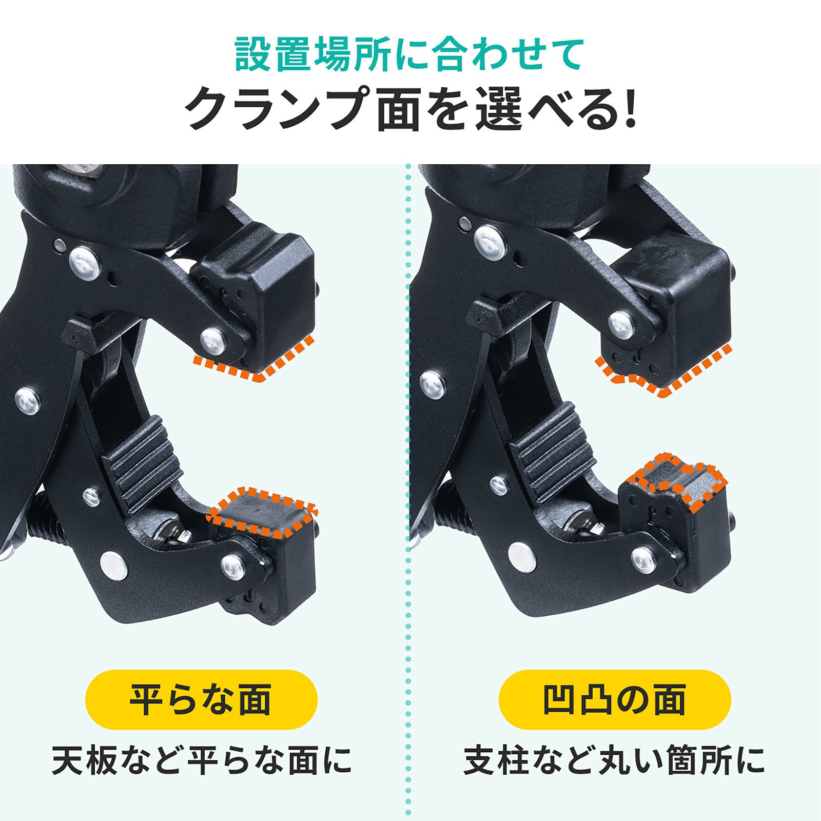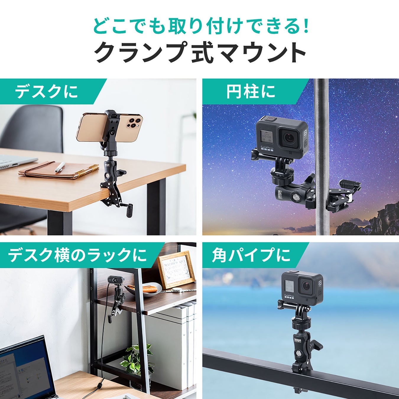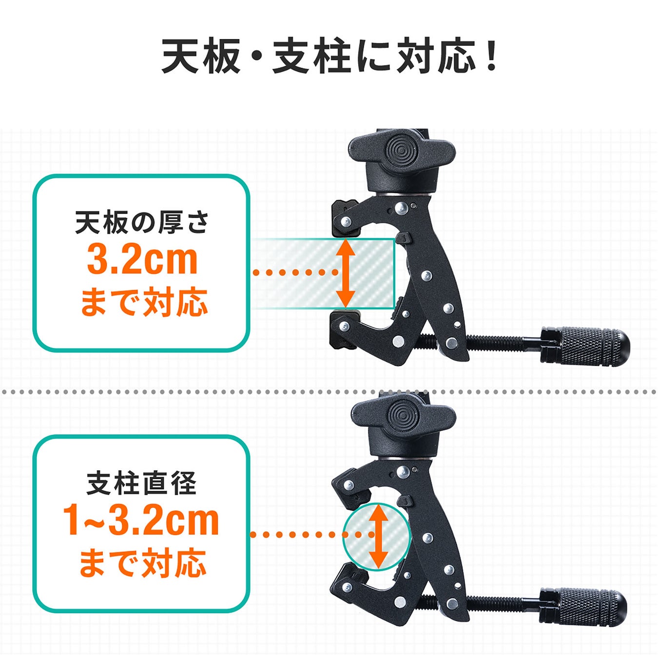 本製品は、カメラや電子機器を天板や支柱などに取り付けできるクランプマウントです。