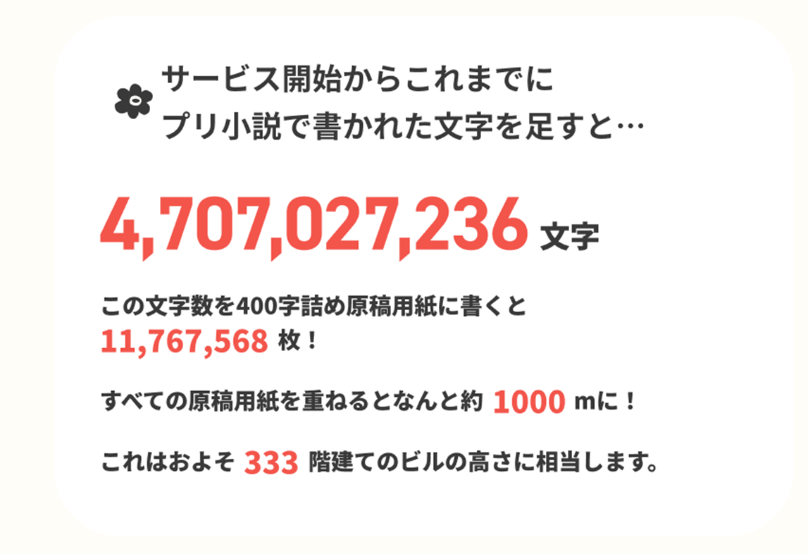 さらに、「プリ小説 byGMO」に投稿いただいた作品の数は100万を超え、投稿された作品の文字数は累計で約47億702万文字と原稿用紙1,100万枚分もの文字数の作品を投稿いただいたこととなります。