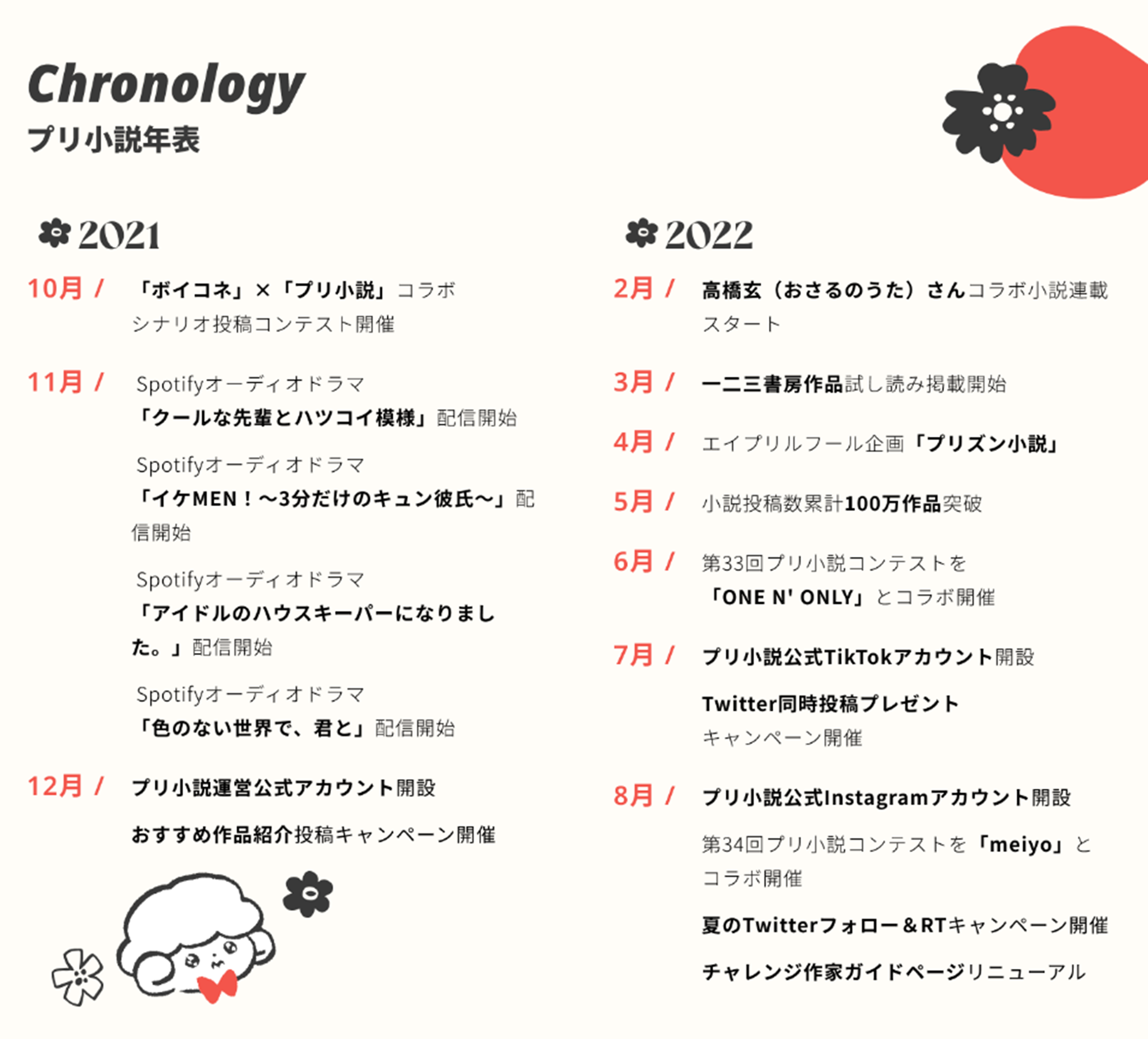 昨年2021年には「プリ小説 byGMO」のオリジナル作品がSpotifyでオーディオドラマ化、さらに2022年にはスターダストプロモーション所属の男性6人組ダンス&ボーカルユニット「ONE N’ ONLY」やユニバーサル ミュージック所属のアーティストでメジャーデビューシングル「なにやってもうまくいかない」がTikTokで5億回以上再生された「meiyo」とコラボコンテストを実施いたしました。