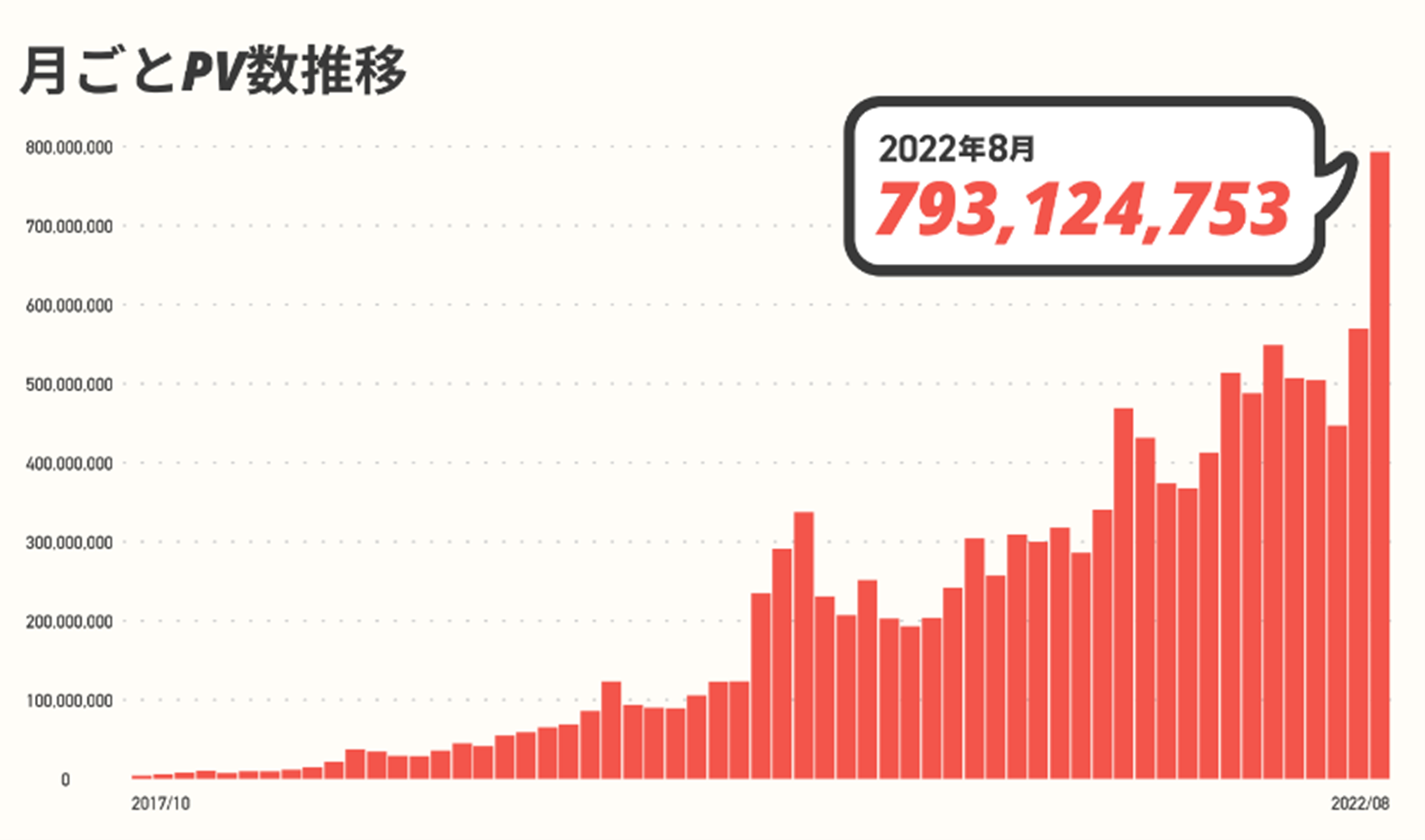 それに伴い、PV数も年々拡大を続けており、サービス開始の2017年からの累計PV数は約124億、2022年8月のPV数は7億9,312万と過去最高を記録、2022年のPV数は8月までで累計44億とすでに前年1年間(42億)を超えています。