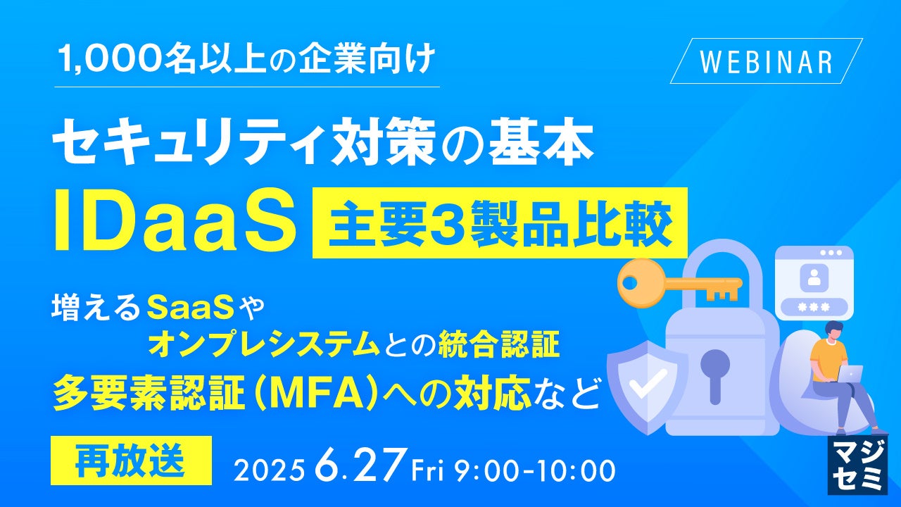 マジセミ株式会社は「【再放送】【1,000名以上の企業向け】セキュリティ対策の基本、IDaaS 主要3製品比較」というテーマのウェビナーを開催します。
