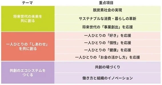 また、当社は、2030年のあるべき姿である「インパクト」を提示しました。そして、3つのインパクト⽬標の一つに「将来世代の未来を共に創る」を掲げ、重点項目の一つとして『サステナブルな消費・暮らしの革新』を設定しております。