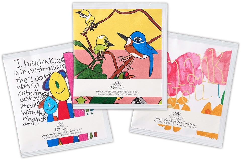 フェアトレード事業を手掛ける「第3世界ショップ」と福祉施設のアトリエ「嬉々!!CREATIVE」のコラボ商品。個性的なアーティストたちが手がける限定アートパッケージです。