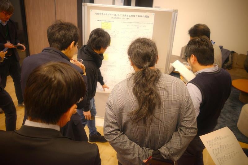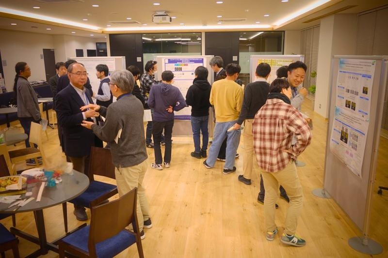 「光創ネクサス」は、「光」を研究手段として用いる多様な分野の研究者が連携し、新たな研究テーマの創出や応用展開につなげることを目的とした研究拠点です。第3回ミーティングに続き、軽食を片手に和やかな雰囲気で議論できるポスターセッション形式で行われました。今回は学内公開として全学から参加者を募集し、教員を中心に、他研究拠点「AI-HPCパートナーズ」の発起人・メンバー、URA、CD(産学連携、学術研究)、学生など、約30人が参加しました。