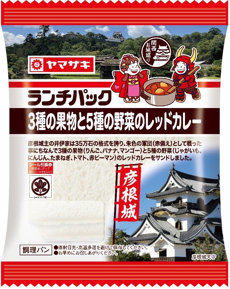 彦根城主の井伊家は35万石の格式を誇り、朱色の軍団(赤備え)として戦った事にちなんで3種の果物(りんご、バナナ、マンゴー)と5種の野菜(じゃがいも、にんじん、たまねぎ、トマト、赤ピーマン)のレッドカレーをサンドしました。