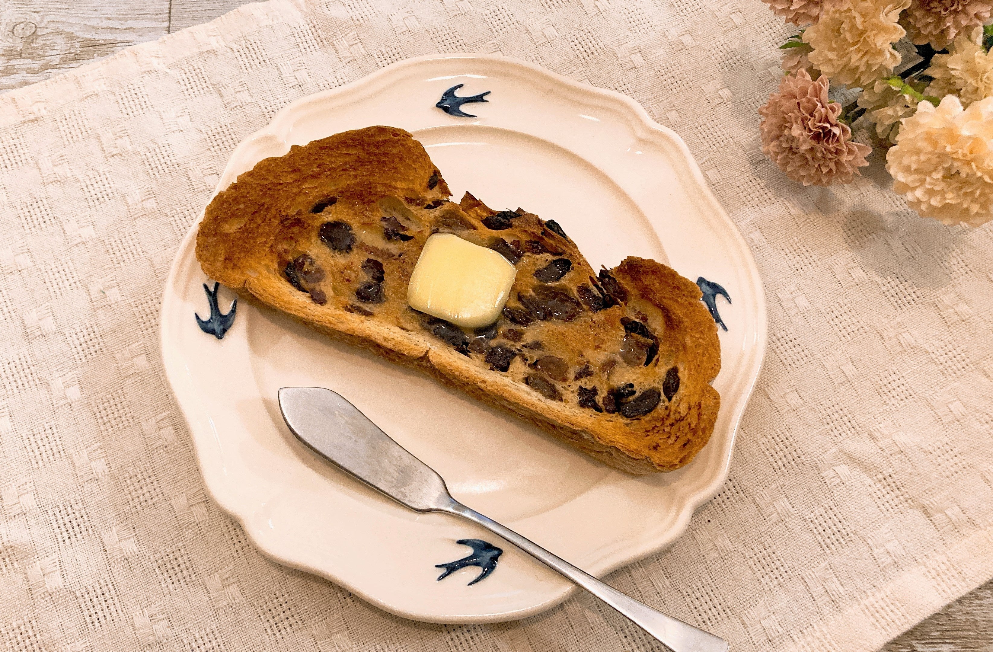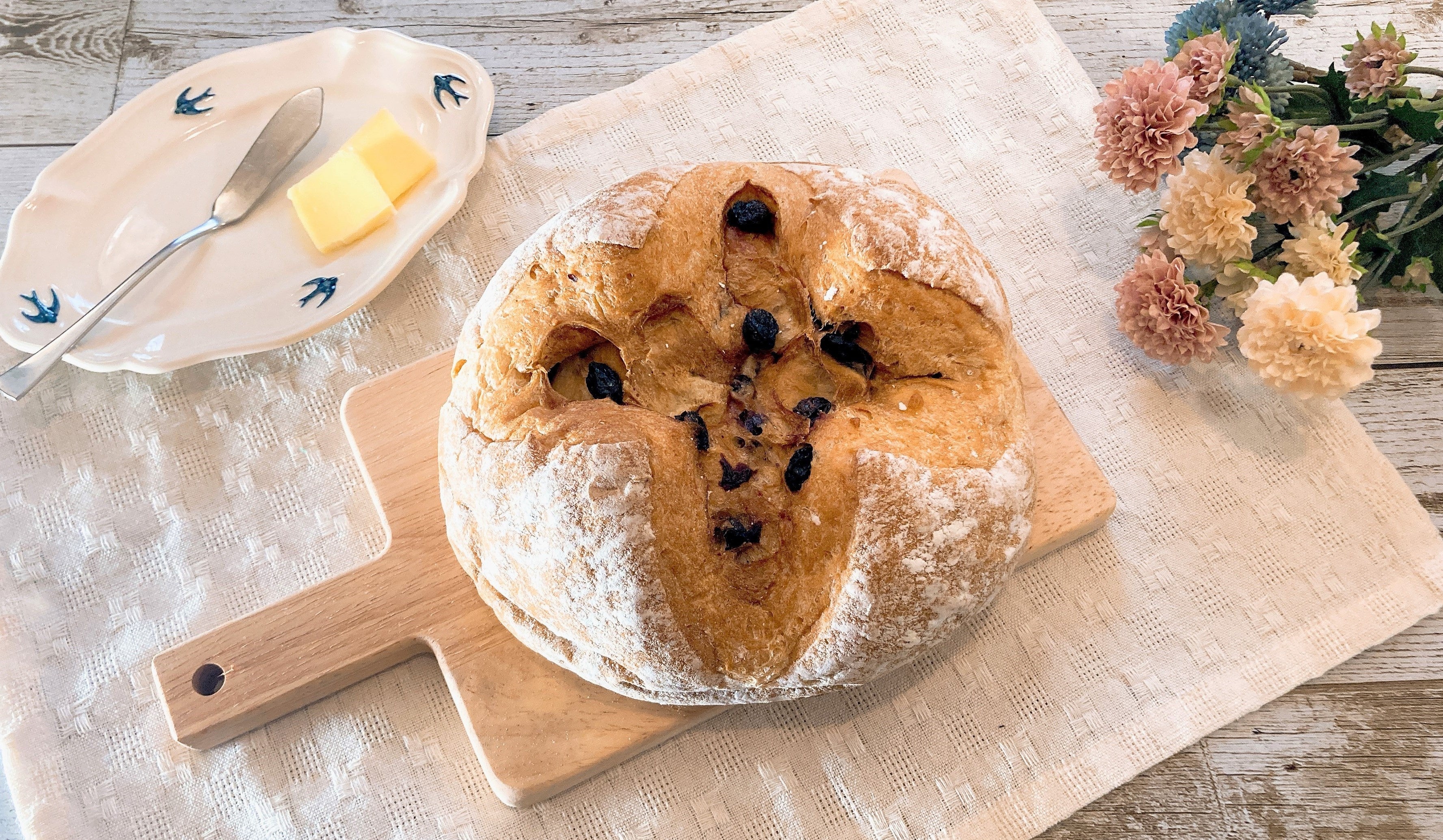 しっとりとした生地でレーズンとラムレーズンをぎっしりと巻いて焼き上げた、直径約18cmの大きなレーズンブールです。重量約400g中、約3割(約140g)ものレーズンを練り込んでいるため、レーズンを存分にお楽しみいただけます。そのまま食べても美味しくいただけますが、軽く切れ目を入れてバタートーストにしていただくと、バターの塩味でレーズンの甘味とラム酒の香りが引き立つ美味しさをお楽しみいただけます。
