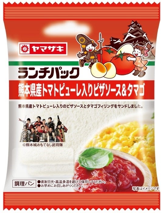 熊本県産トマトピューレ入りのピザソースとタマゴフィリングをサンドしました。「熊本城おもてなし武将隊」コラボ商品です。