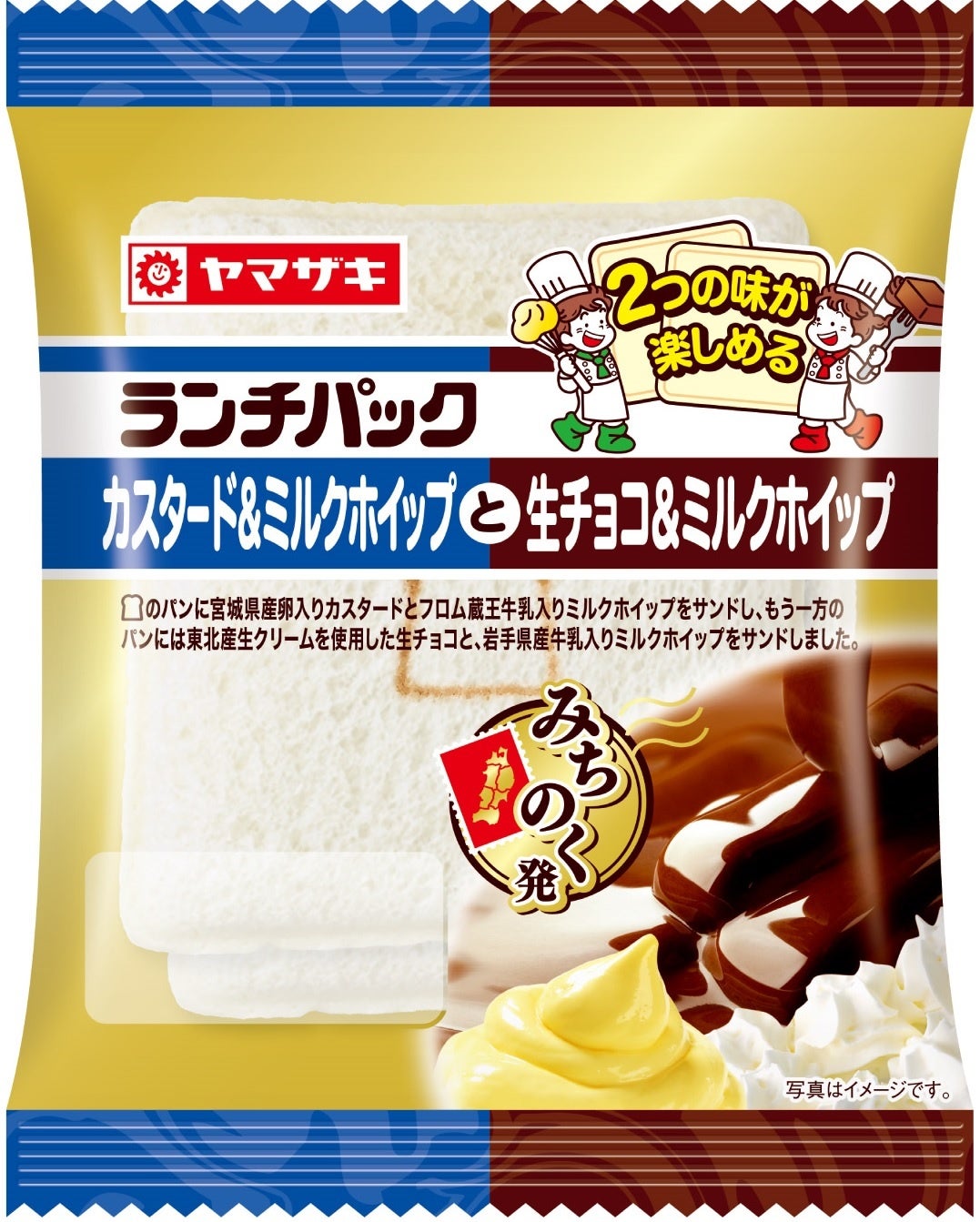 一方の パンに宮城県産卵入りカスタードとフロム蔵王牛乳入りミルクホイップをサンドし、もう一方のパンには東北産生クリームを使用した生チョコクリームと、岩手県産牛乳入りミルクホイップをサンドしました。