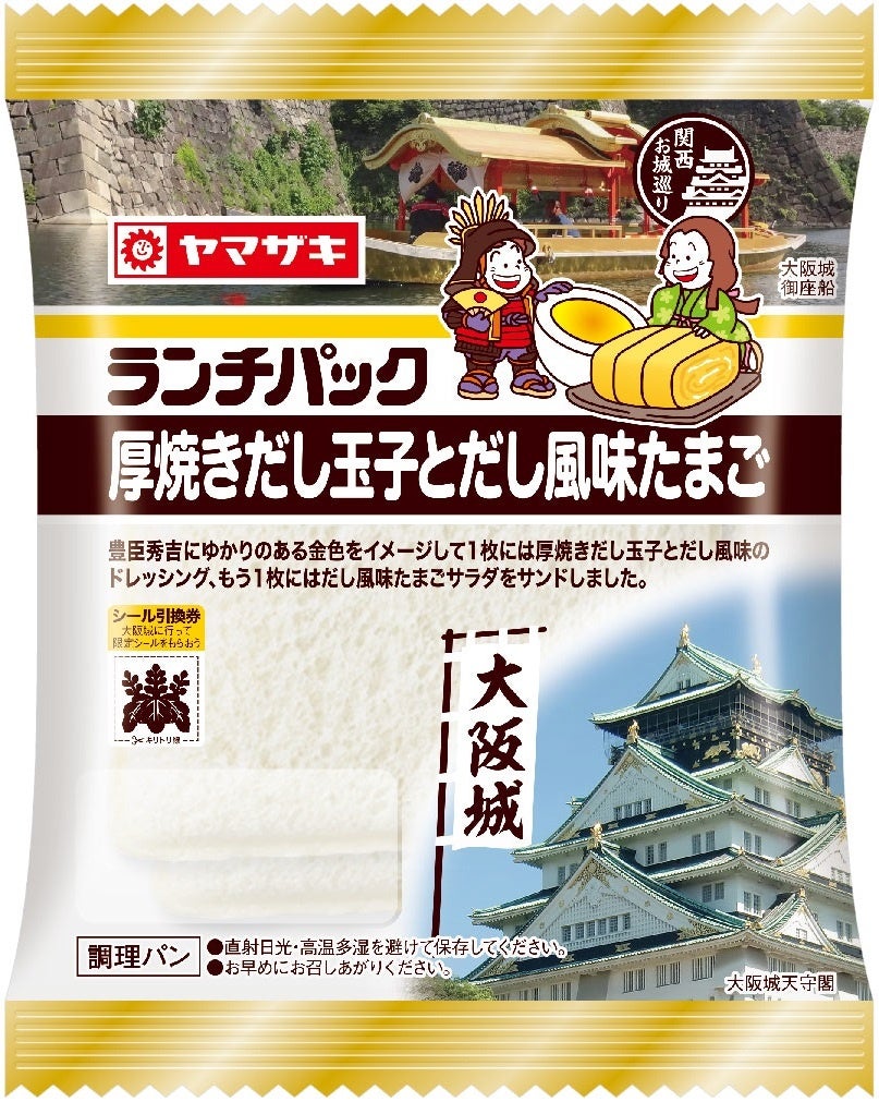 豊臣秀吉にゆかりのある金色をイメージして1枚には厚焼きだし玉子とだし風味のドレッシング、もう1枚にはだし風味たまごサラダをサンドしました。