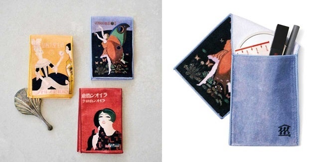 非水が手掛けた三越百貨店のポスターも含む、大正~昭和のレトロモダンな広告ポスターがプリントされた、ポーチにもなるタオルハンカチです。