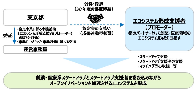 そこで、この度、東京都は、持続的・自立的な創薬・医療分野のスタートアップコミュティを育成するエコシステムの形成を目指し、創薬・医療系スタートアップを支援するとともに、東京都と連携してエコシステム形成に取り組むエコシステム形成支援者(プロモーター)を以下のとおり公募します。